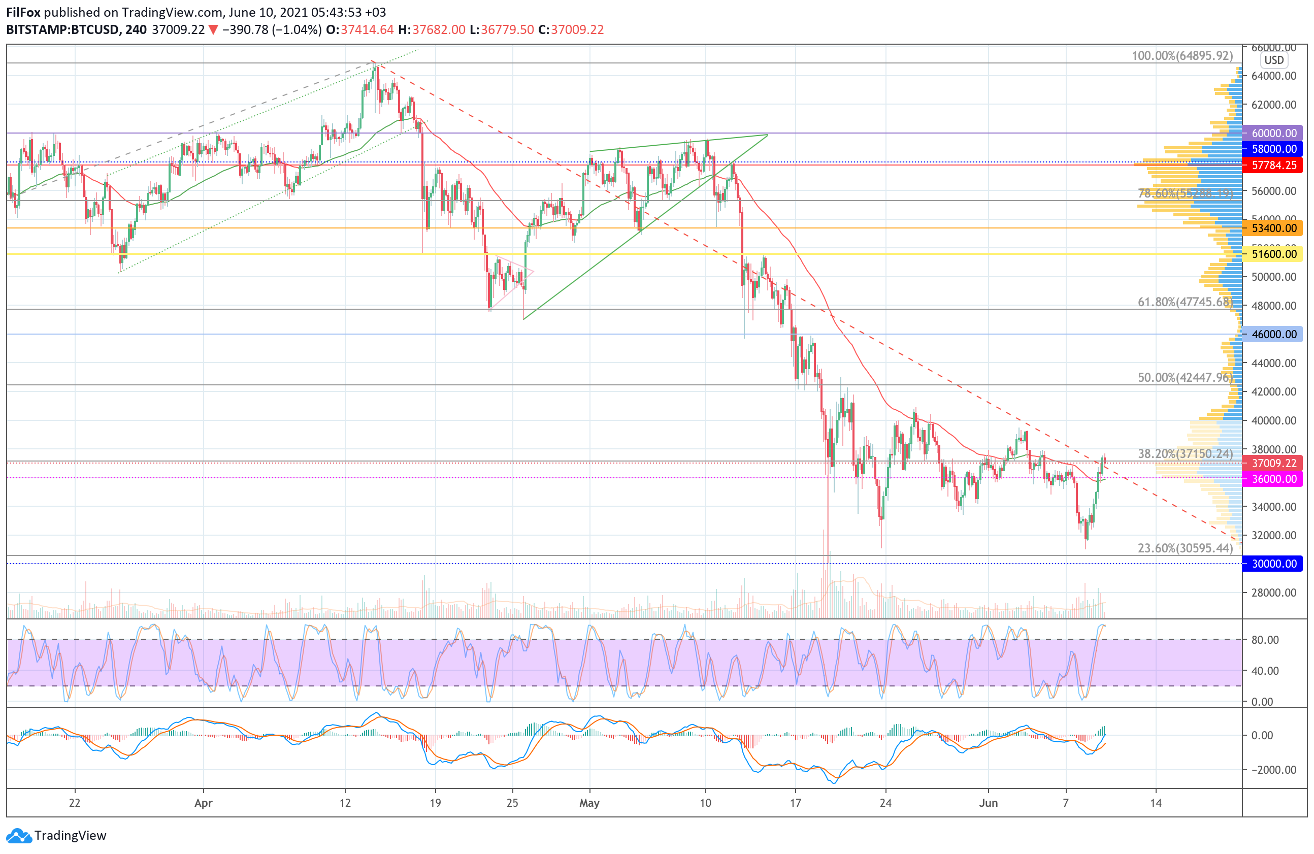 В ближайшее время следует ожидать краткосрочную консолидацию цены BTC в районе уровня 38.2% фибо (37150.24 USD). Если паре удастся удержаться выше этого уровня фибоначчи, то возможно восстановление к отметке 40000.00 USD.