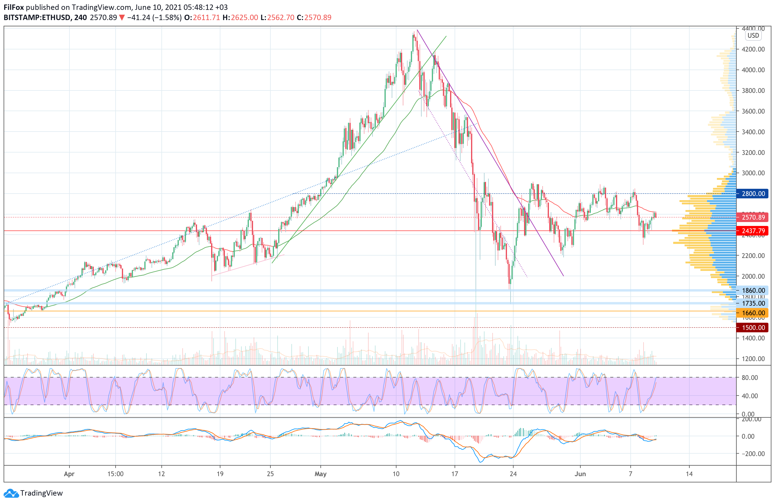 Вчера линия POC удержала цену Ethereum в краткосрочной консолидации, и уже во второй половине дня пара восстановилась в область средних цен. На утро четырёхчасовая EMA55 сдерживает цену эфира от дальнейшего восстановления к сопротивлению 2800.00 USD.