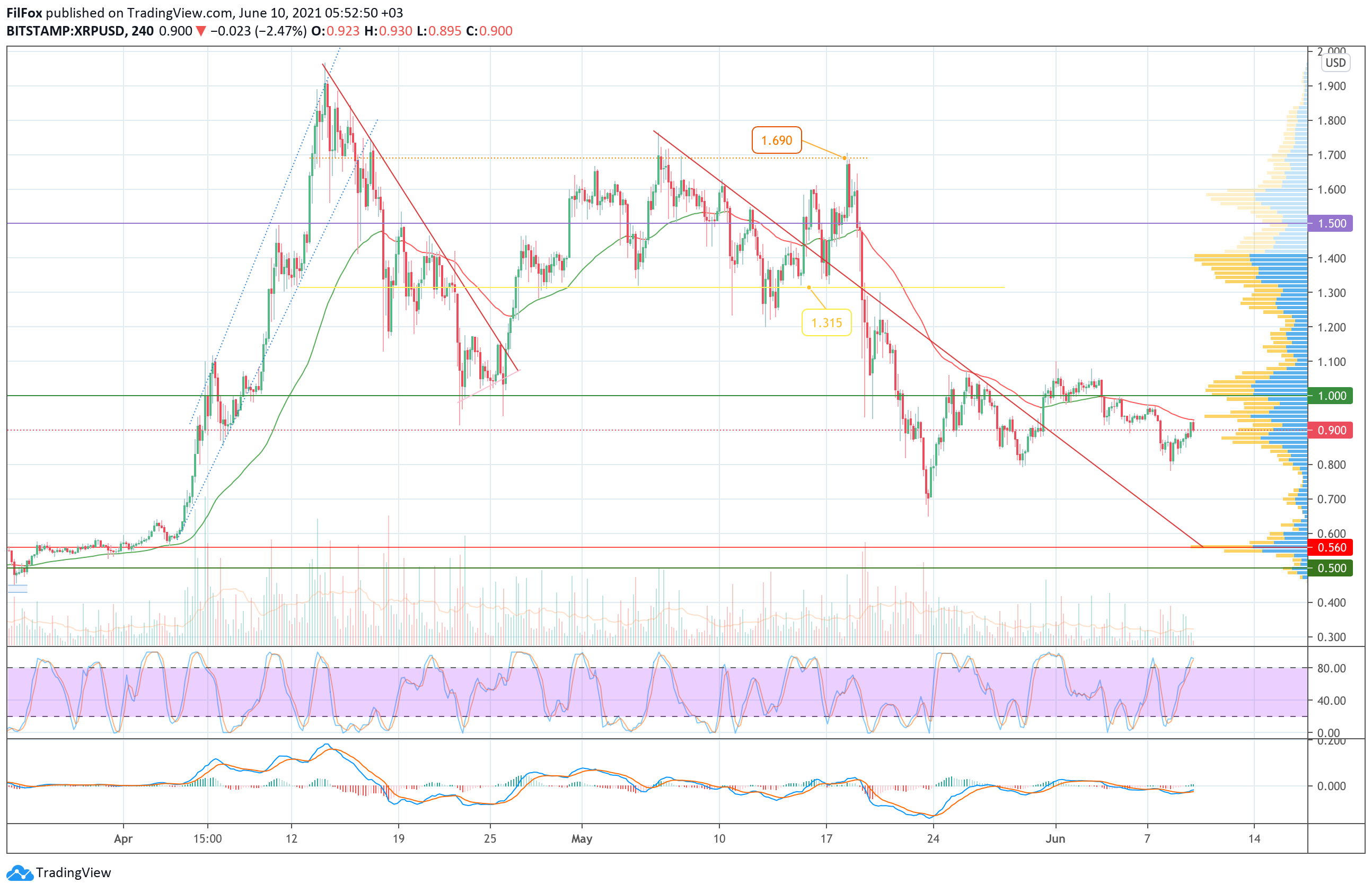 Вчера покупатели смогли нарастить объёмы покупок выше среднего уровня и восстановили цену XRP к четырёхчасовой EMA55.