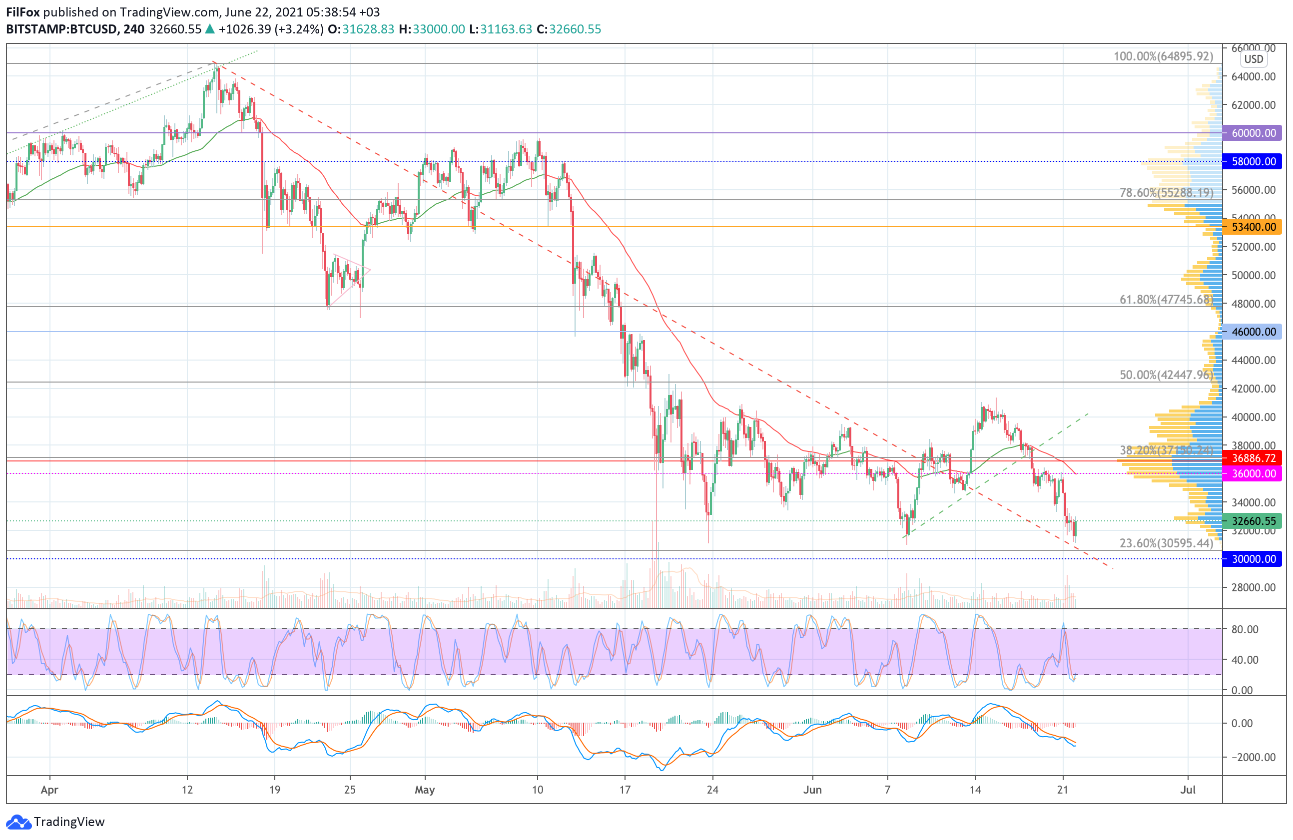 Вчера снижение цены BTC продолжилось, и уже в первой половине дня пара достигла слабой поддержки 32500.00 USD. Этот уровень немного замедлил снижение, но во второй половине дня медведи продавили слабую поддержку и сегодня ночью вплотную подошли к красной линии даун-тренда.