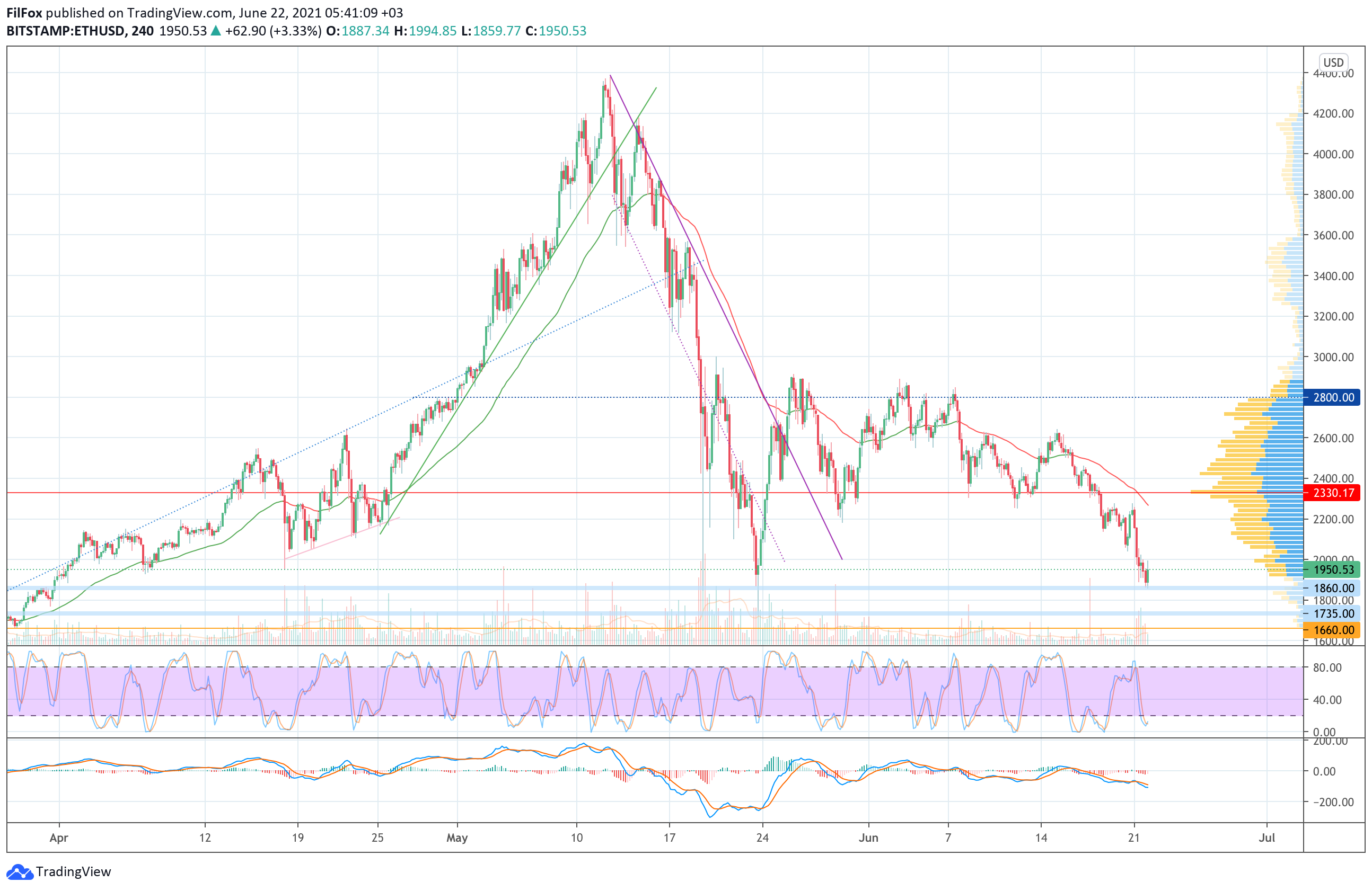 Вчера днём медведи прорвали психологическую отметку 2000.00 USD и в итоге протестировали поддержку 1860.00 USD. Этот уровень отразил натиск продавцов, а покупатели восстановили цену эфира в район 2000.00 USD.