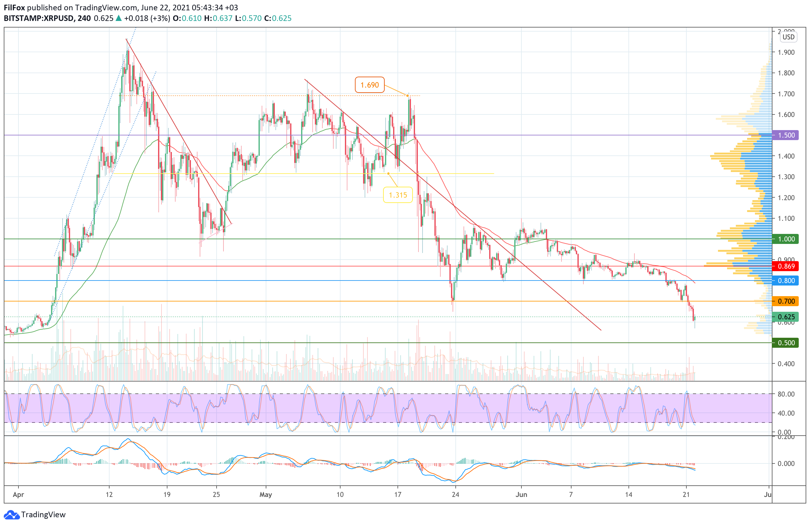 Сегодня ночью цена XRP обновила двухмесячный минимум до отметки 0.570 USD. На утро можно наблюдать небольшой отскок, но объёмы покупок слишком маленькие, и цена пока не может восстановиться к уровню 0.650 USD.