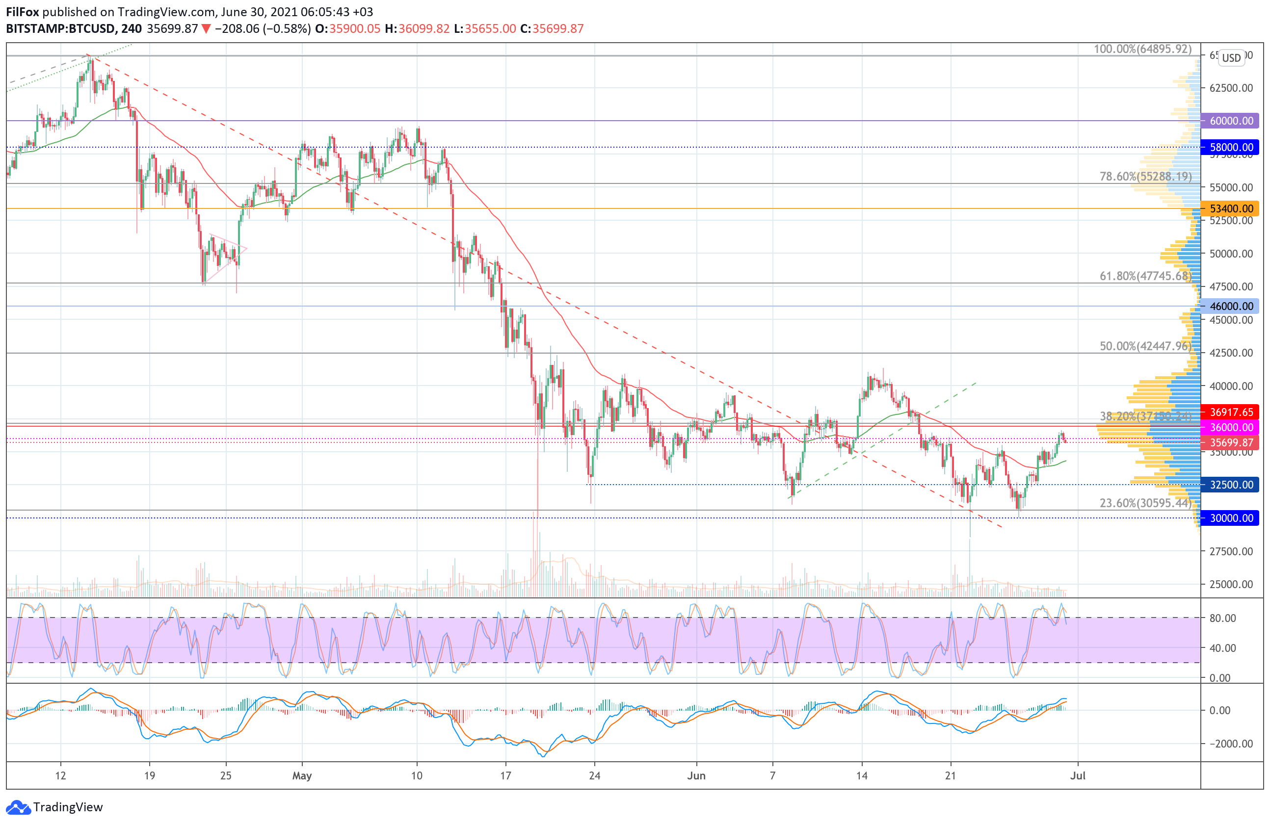 Сегодня утром давление медведей усилилось и пара откатилась ещё глубже. В ближайшее время цена BTC вернётся к верхней границе боковика на отметке 35000.00 USD. Полагаем, сегодня она сможет сыграть роль поддержки и остановить сегодняшний откат, а в завершении дня быки попытаются протестировать целевой уровень 38.2% фибо (37150.24 USD).