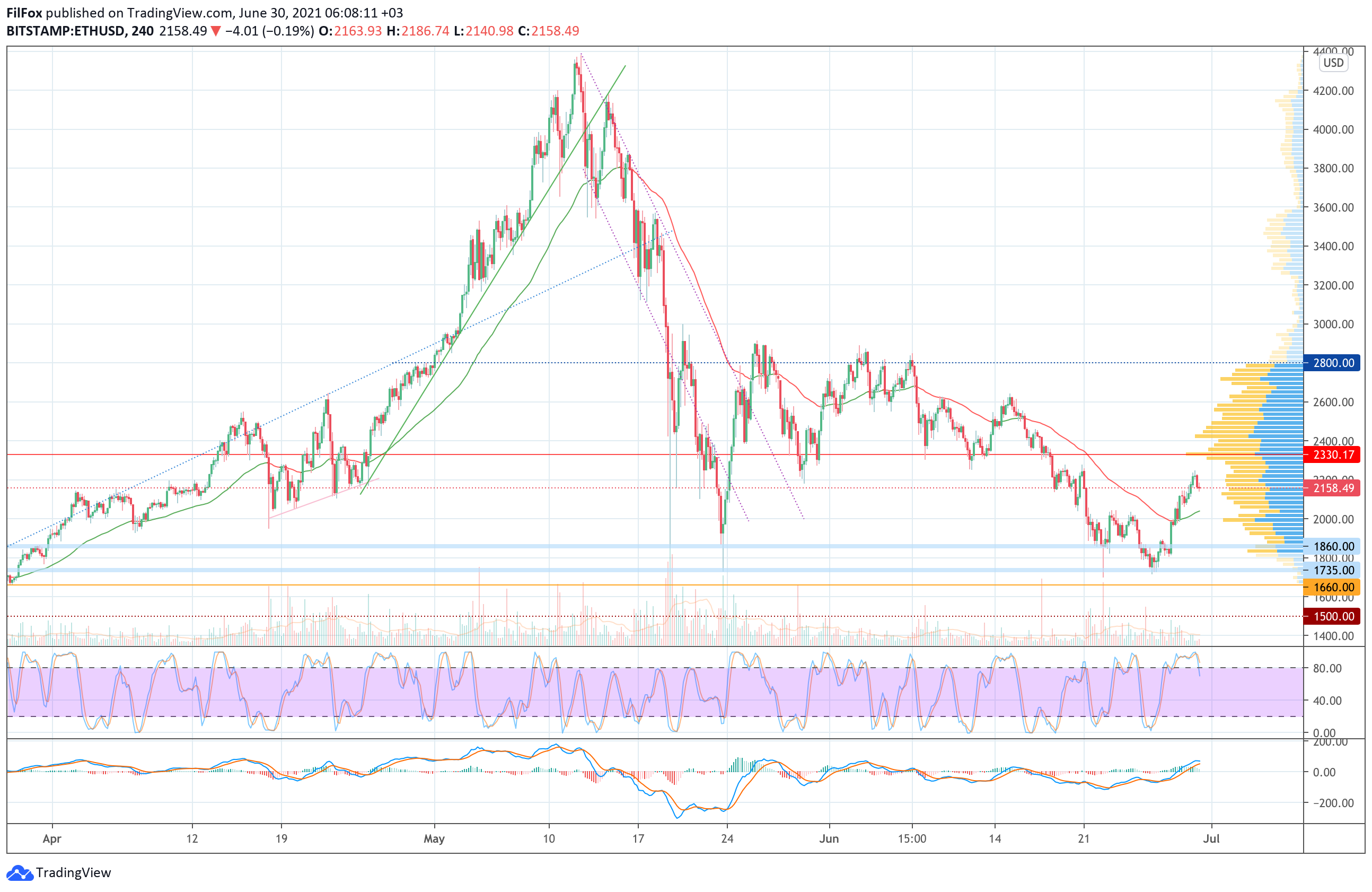 Вчера в первой половине дня покупателям удалось вытащить цену эфира из краткосрочной консолидации, а во второй половине дня пара уже смогла пробить сопротивление 2200.00 USD. Дневной максимум обозначен в точке 2247.00 USD.