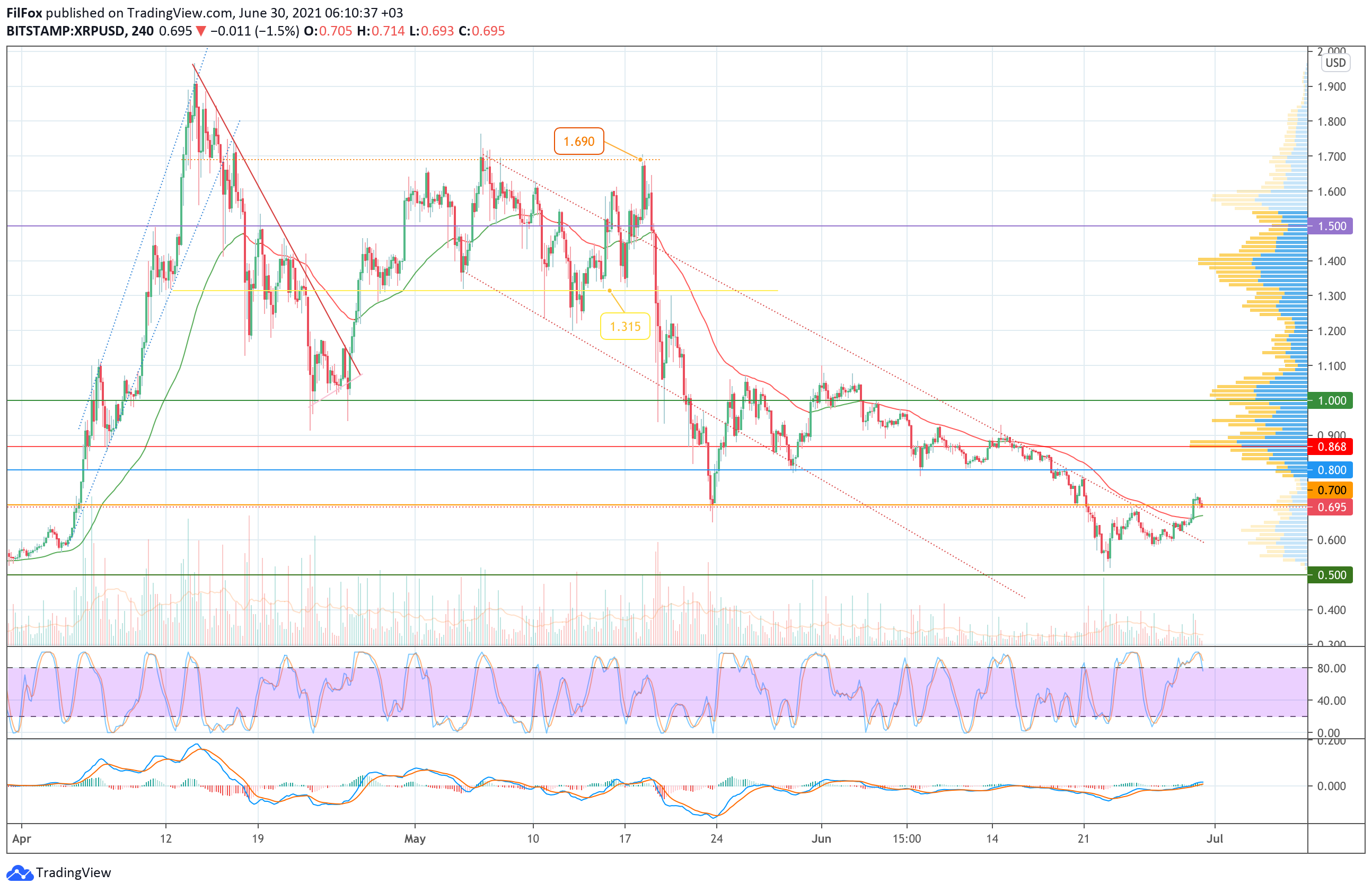 Вчера утром быки смогли усилить натиск и цена XRP прорвала уровень средних цен в виде четырёхчасовой EMA55. Во второй половине дня пара уверенно преодолела уровень 0.700 USD, но до сегодняшнего утра она не смогла удержаться выше этой оранжевой отметки.