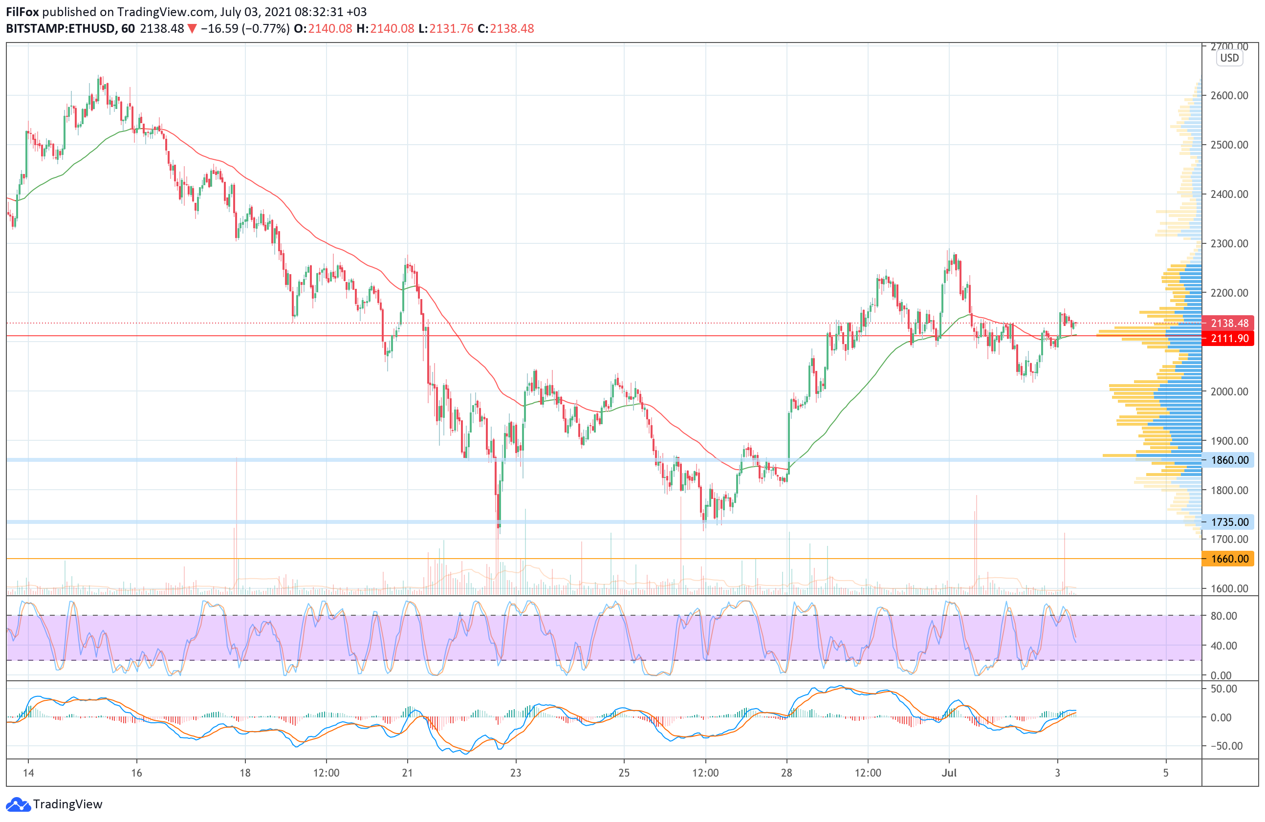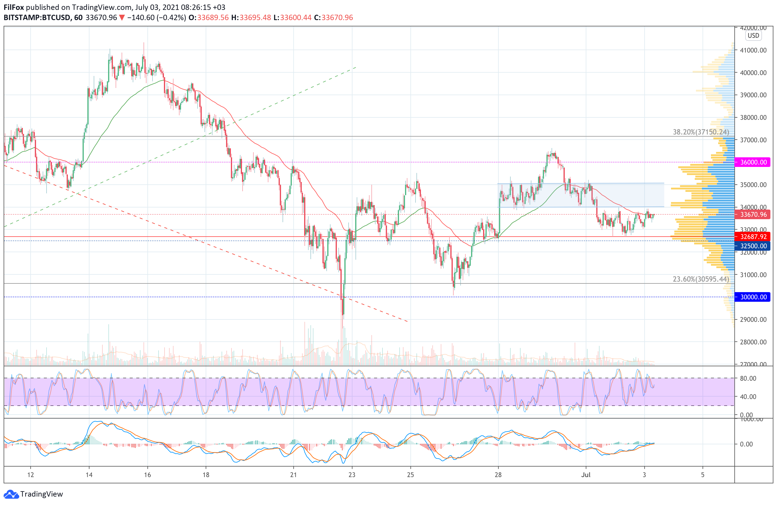 В минувшую пятницу объёмы торгов оставались на низком уровне и цена биткоина не опускалась ниже отметки 32700.00 USD. Во второй половине дня покупатели на малых объёмах попытались восстановить цену в область часовой скользящей средней EMA55.