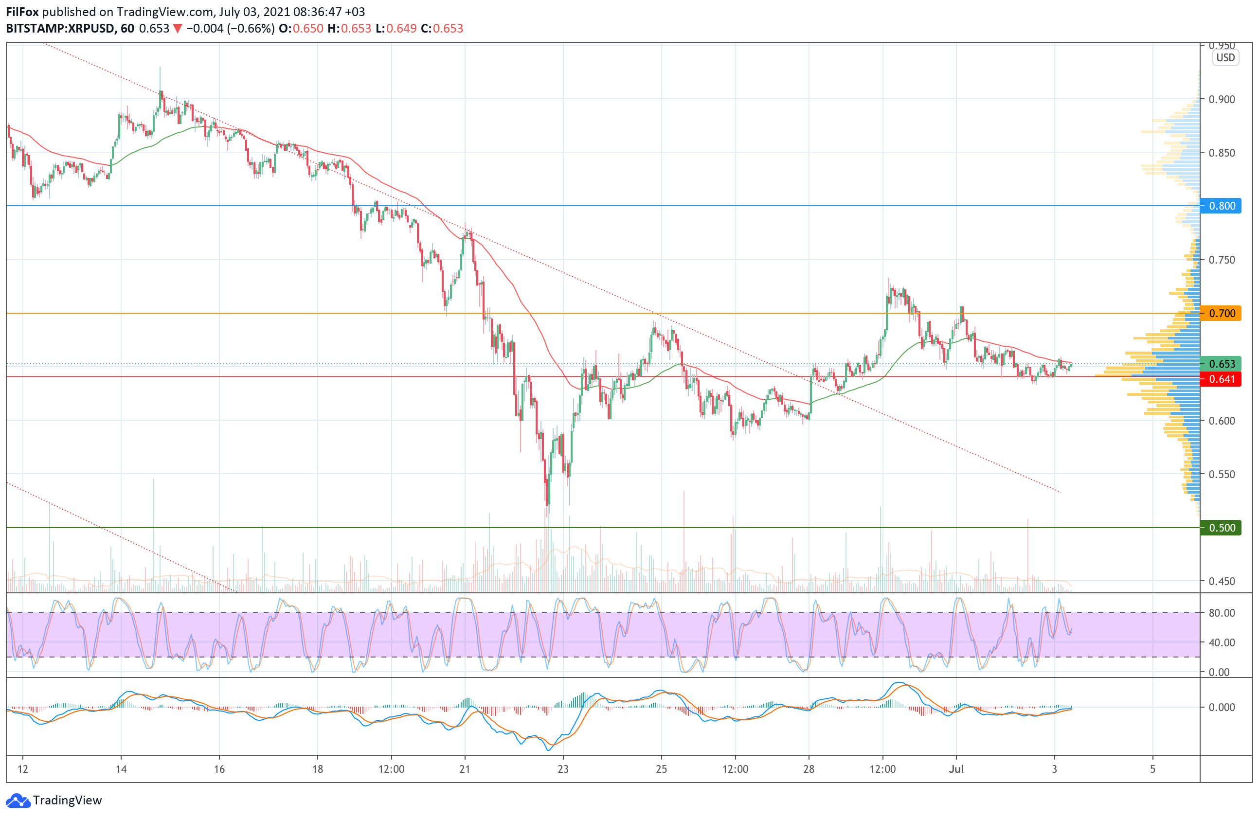Вчера цена XRP закрепилась в районе линии POC (0.641 USD) и консолидировалась в узком боковике.