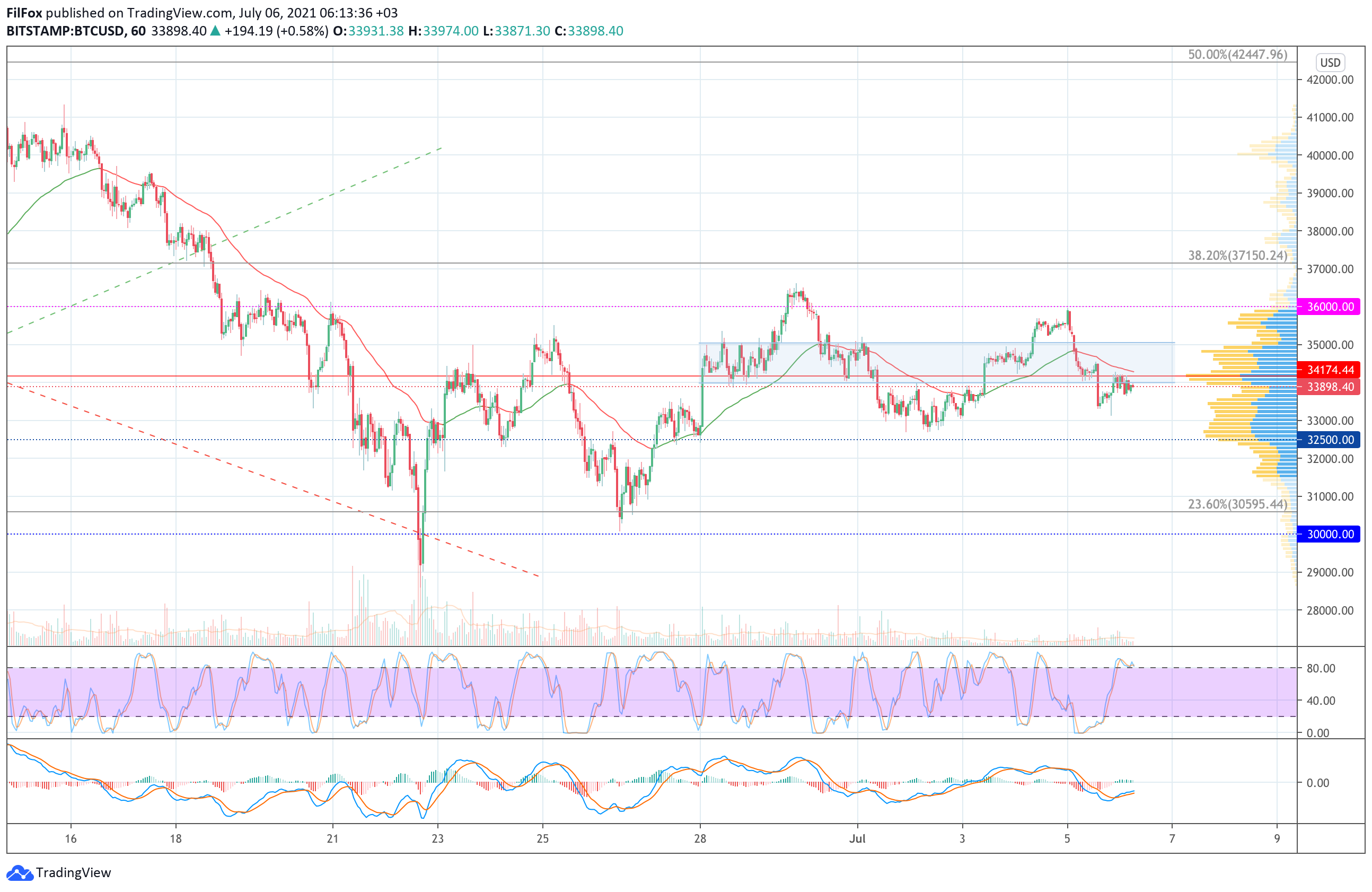 Вчера утром продавцы прижали цену BTC к нижней границе бокового коридора 34000.00 USD. Во второй половине дня давление медведей усилилось и они выбили пару за пределы голубого диапазона.