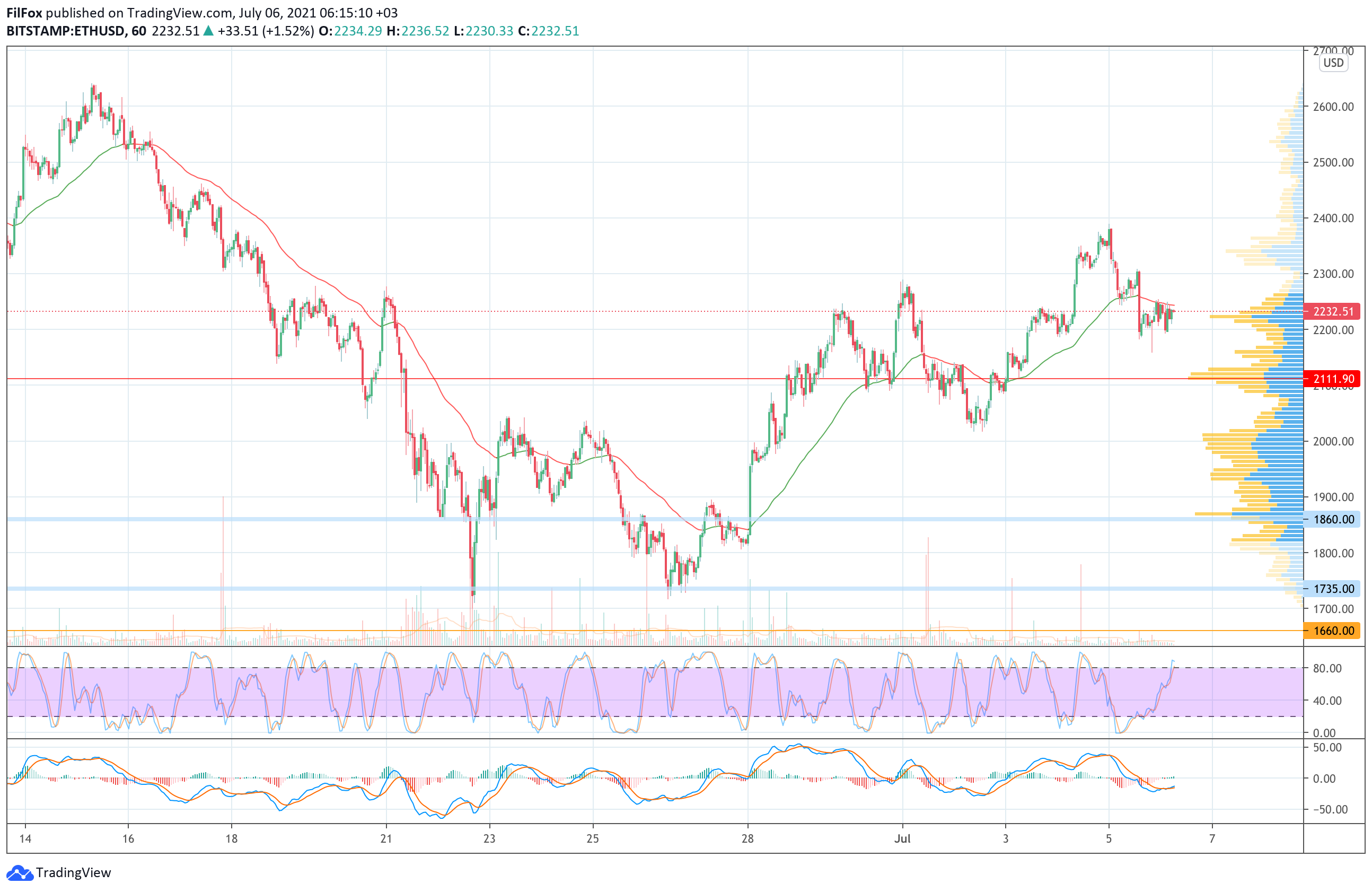 Вчера в первой половине дня часовая EMA55 удерживала цену ETH от снижения. Днём давление медведей пробило поддержку скользящей средней и локальный минимум зафиксирован в районе отметки 2159.00 USD.