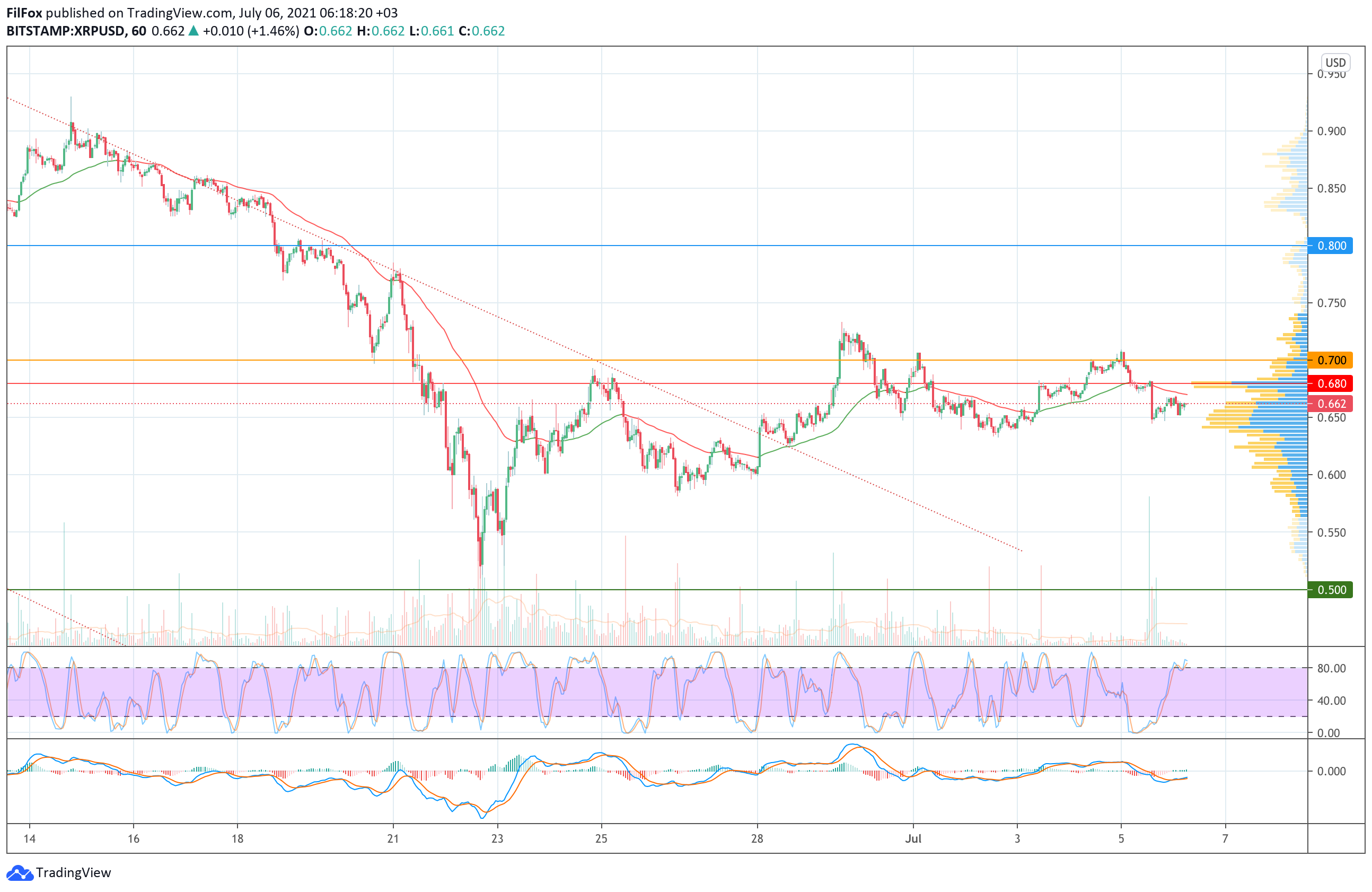 Вечером цена XRP немного восстановилась, но вернуться выше EMA55 пара пока не может. Если сегодня покупатели не смогут сформировать бычий импульс, то снижение продолжится к отметке 0.600 USD.