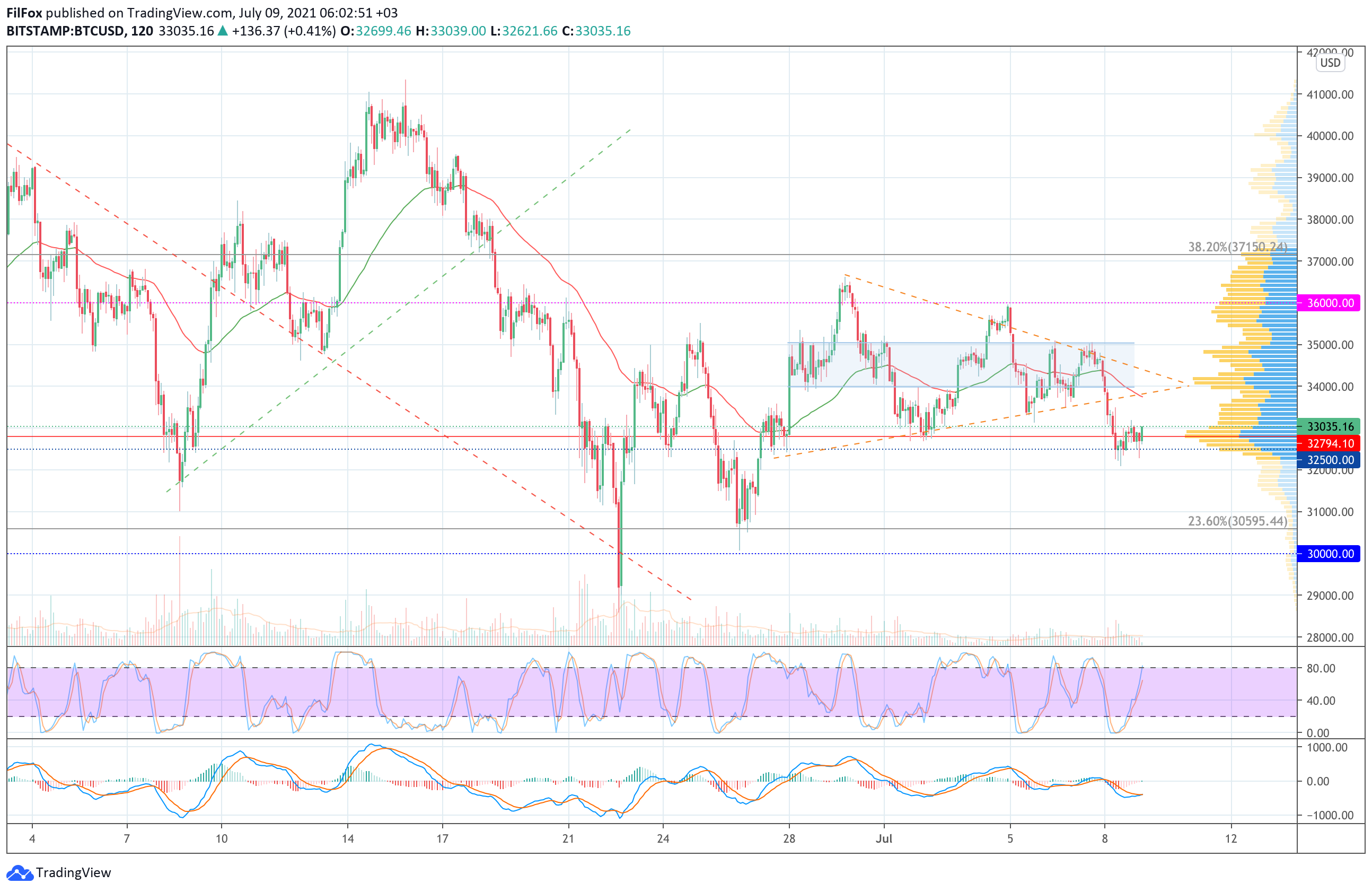Поддержка 32500.00 USD приостановила падение, и пара консолидируется в узком боковом диапазоне. Если сегодня покупатели не смогут перехватить инициативу и сформировать ложный бычий импульс в область сопротивления на отметке 36 тысяч долларов, то до конца недели пара откатится к уровню 23.6% фибо (30595.44 USD).