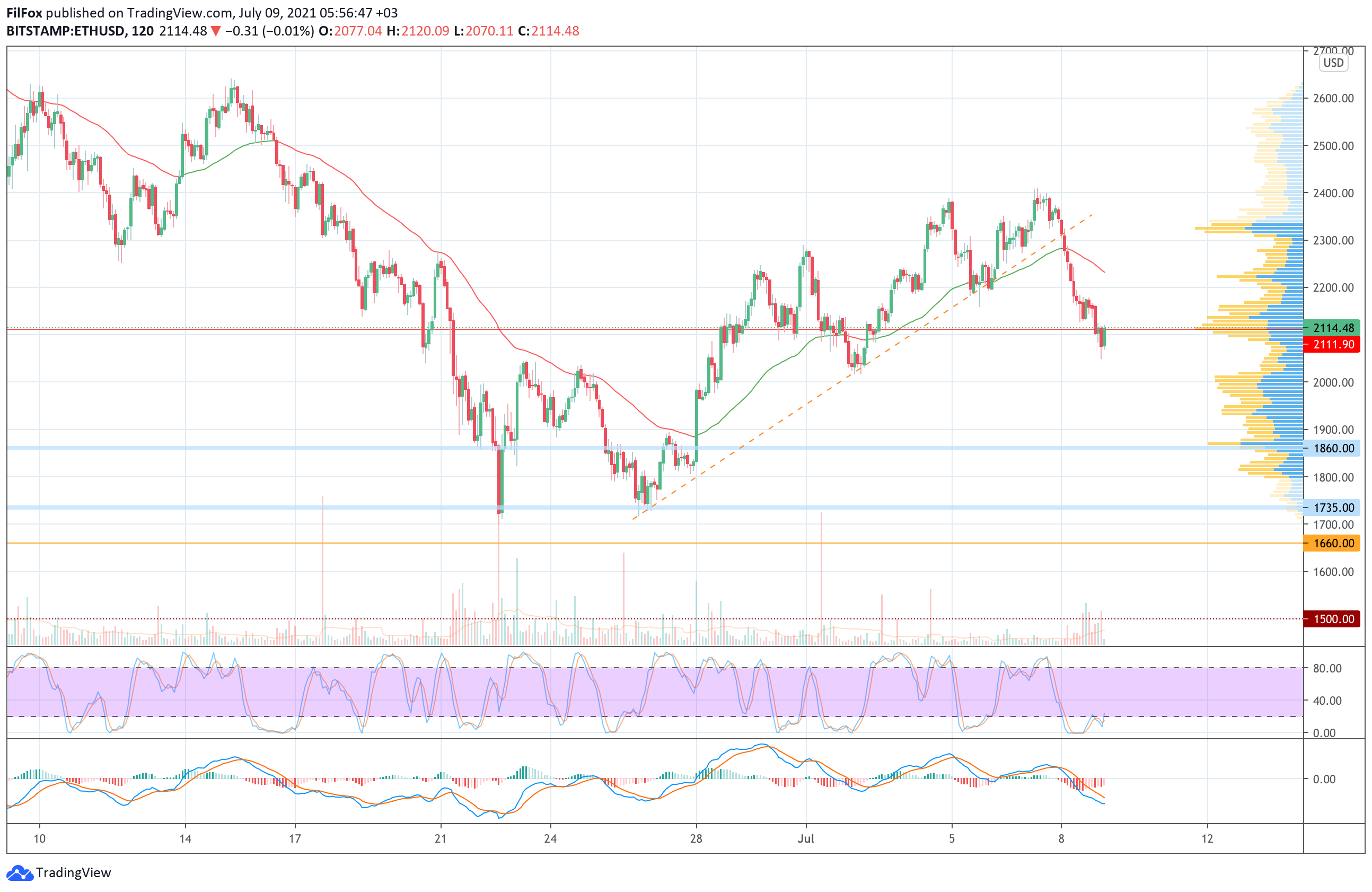 Вчера в первой половине дня давление со стороны продавцов начало усиливаться и в итоге цена Ethereum откатилась к линии POC (2111.90 USD).