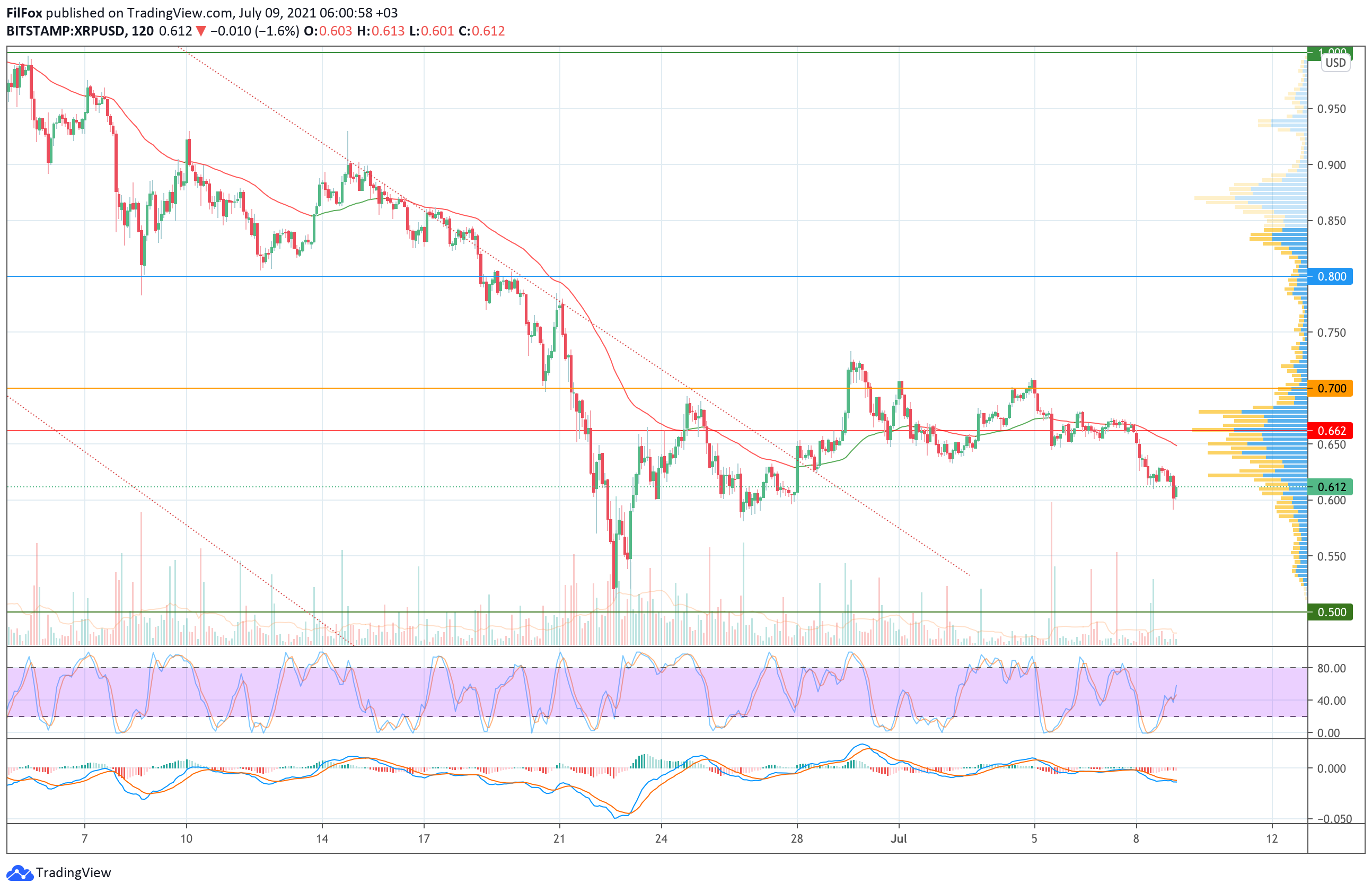 Вчера цена XRP продолжила снижение и в завершении дня достигла поддержки 0.600 USD. Сегодня ночью медведи прокололи эту поддержку, обозначив минимум в точке 0.592 USD, но на утро цена отскочила в район отметки 0.620 USD.