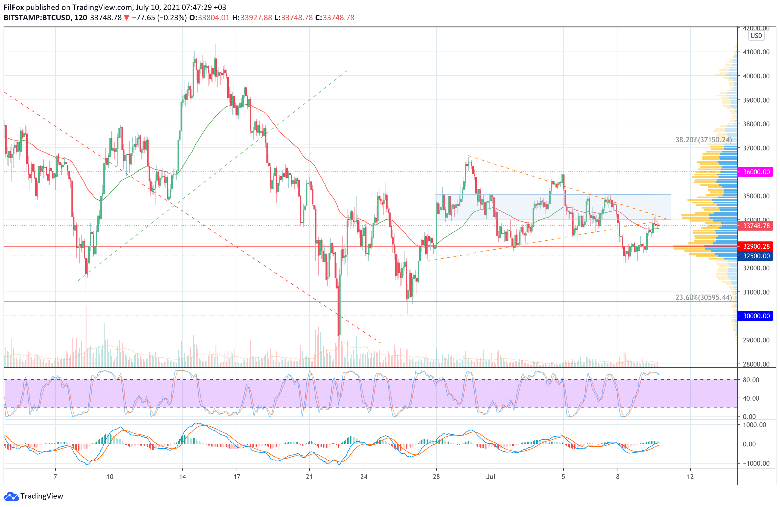 Если медведи оттеснят пару ниже уровня средних цен, то всё вернётся к поддержке 32500.00 USD. В завершении недели медвежье давление может усилиться, и тогда цена биткоина откатится в область 23.6% фибо (30595.44 USD).
