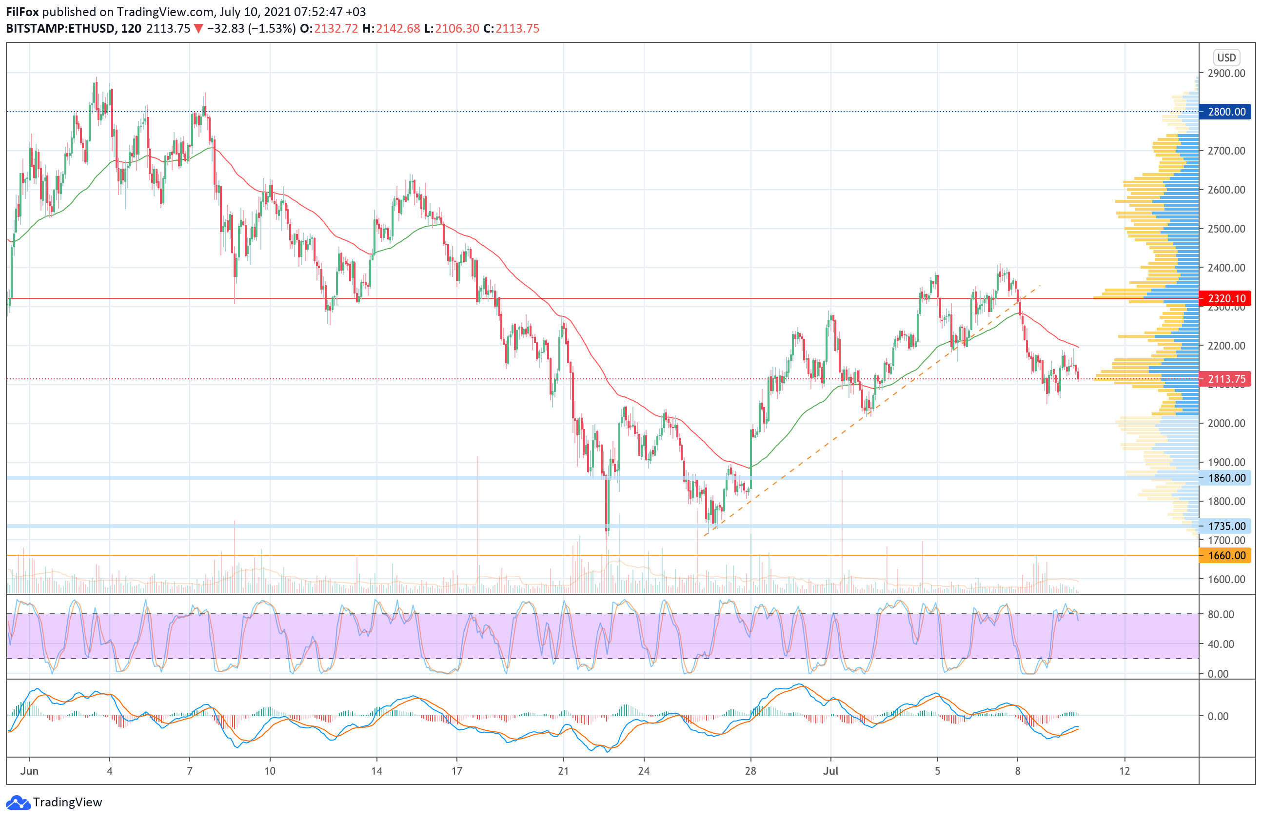 На сегодняшнее утро цена эфира откатилась в район отметки 2100.00 USD, а при усилении медвежьего натиска падение продолжится ниже психологической отметки 2000.00 USD.