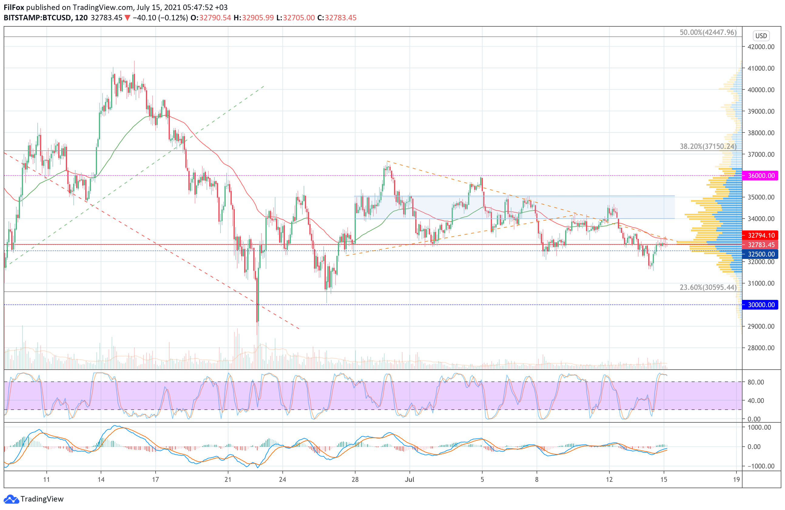 Вчера в первой половине дня ощущалось доминирование продавцов, и цена биткоина обновила июльский минимум в районе отметки 31589.00 USD. Днём покупатели смогли остановить снижение, восстановив пару выше уровня 32500.00 USD.