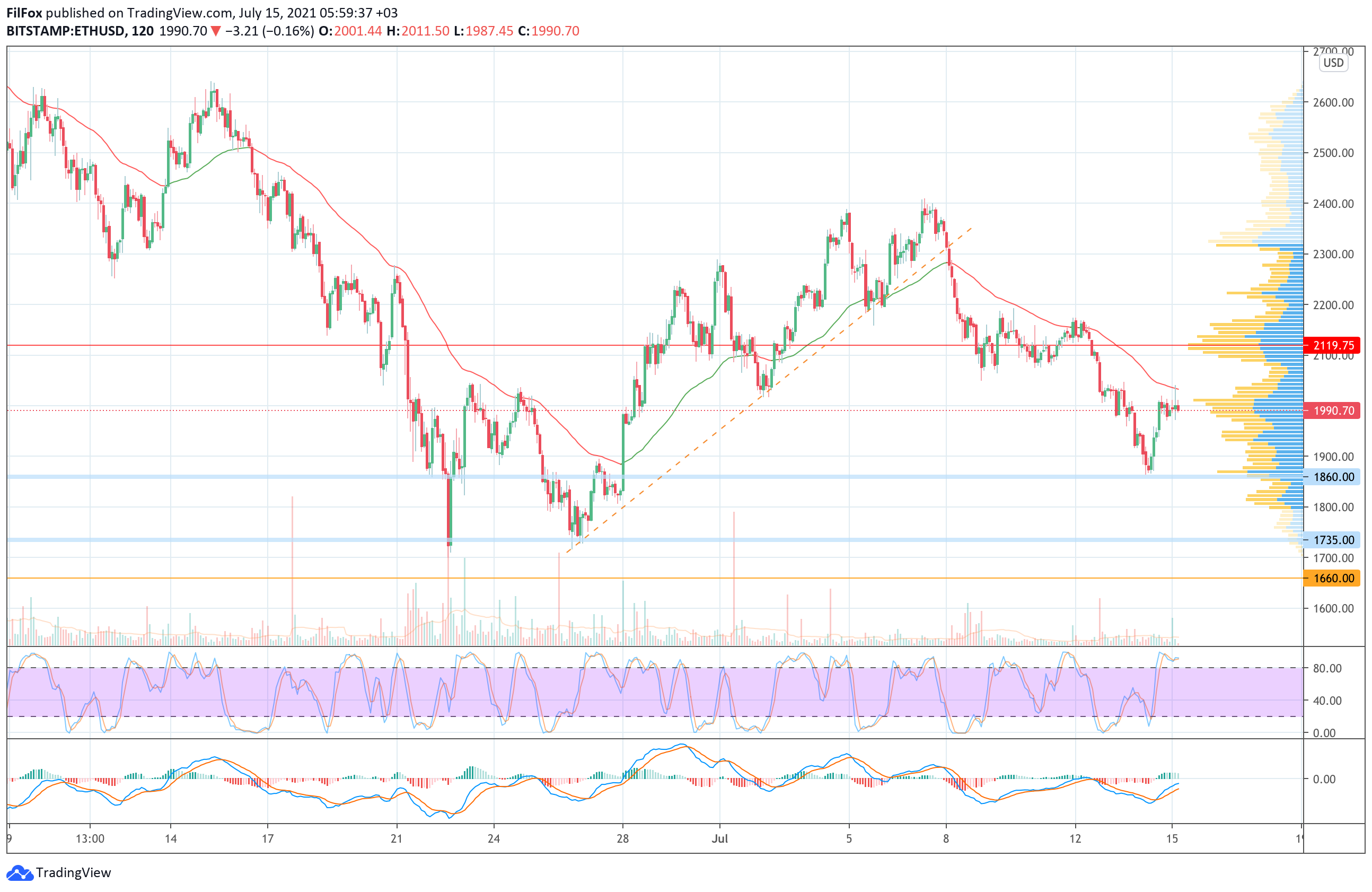 Вчера утром снижение цены Ethereum остановилось в районе поддержки 1860.00 USD. Покупатели постарались восстановить цену эфира выше двух тысяч долларов, но закрепиться над этим психологическим уровнем пока не удаётся.