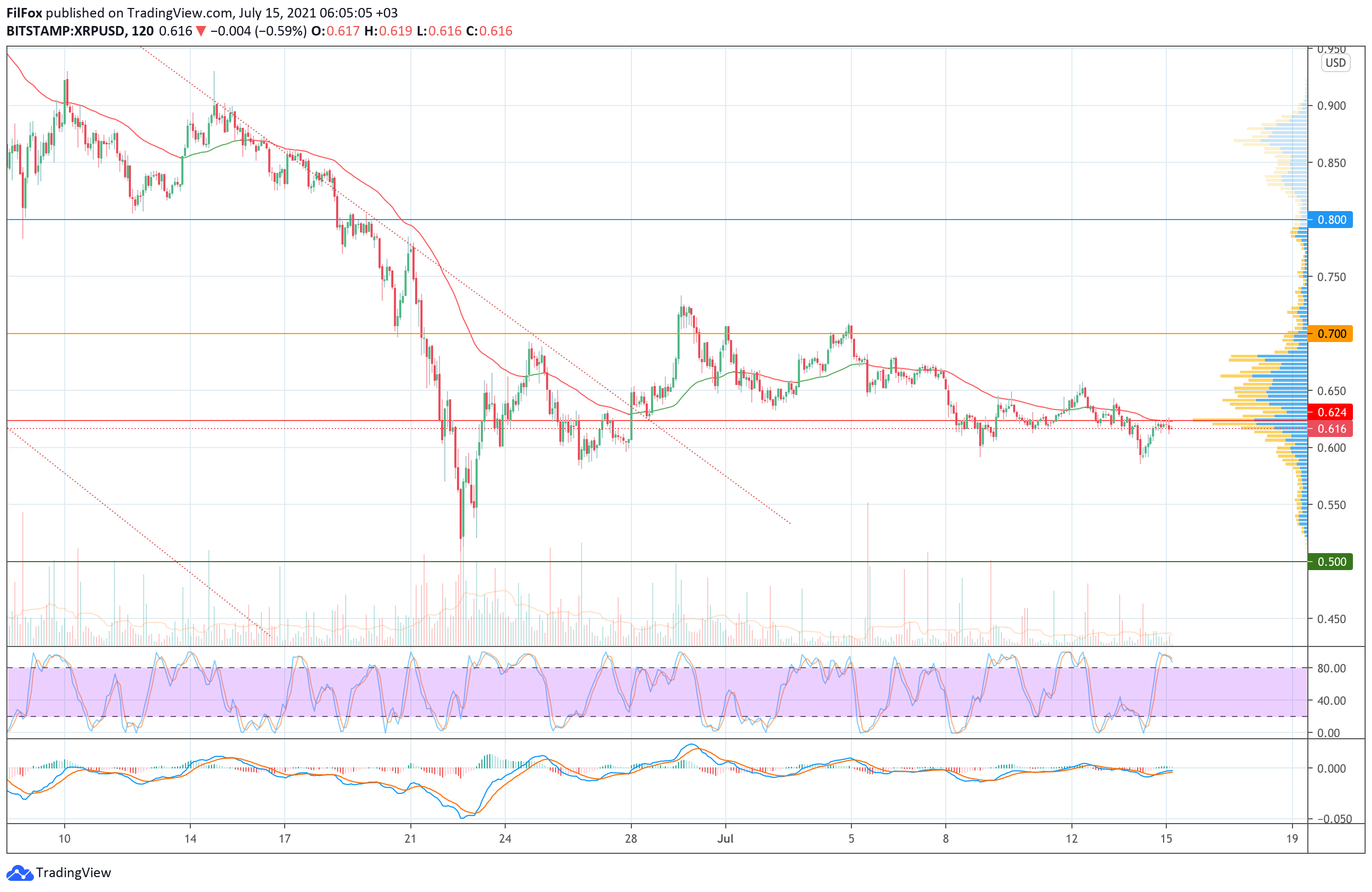 Вчера утром объёмы продаж сократились и снижение цены XRP остановилось в точке июльского минимума 0.586 USD.