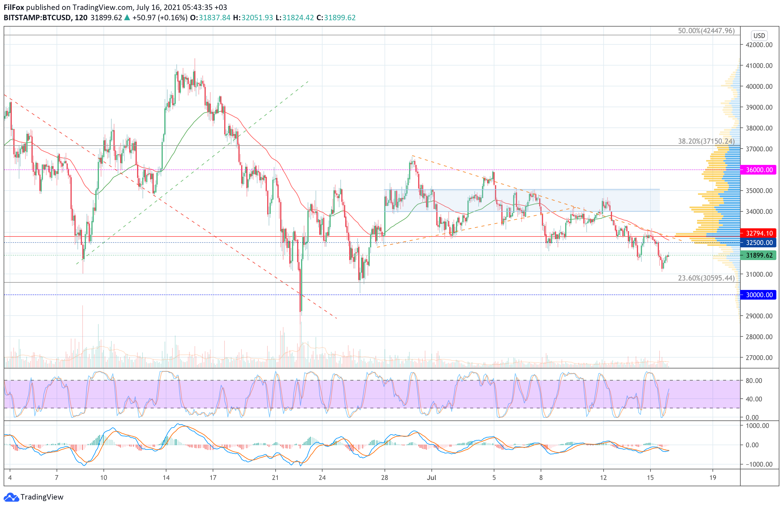 Вчера утром покупатели не смогли сформировать импульс для прорыва пунктирной нисходящей линии тренда. Давление медведей заставило цену биткоина обновить июльский минимум до отметки в районе 31121.00 USD. Поздно вечером натиск продавцов ослаб и за минувшую ночь пара смогла восстановиться к уровню 32000.00 USD.