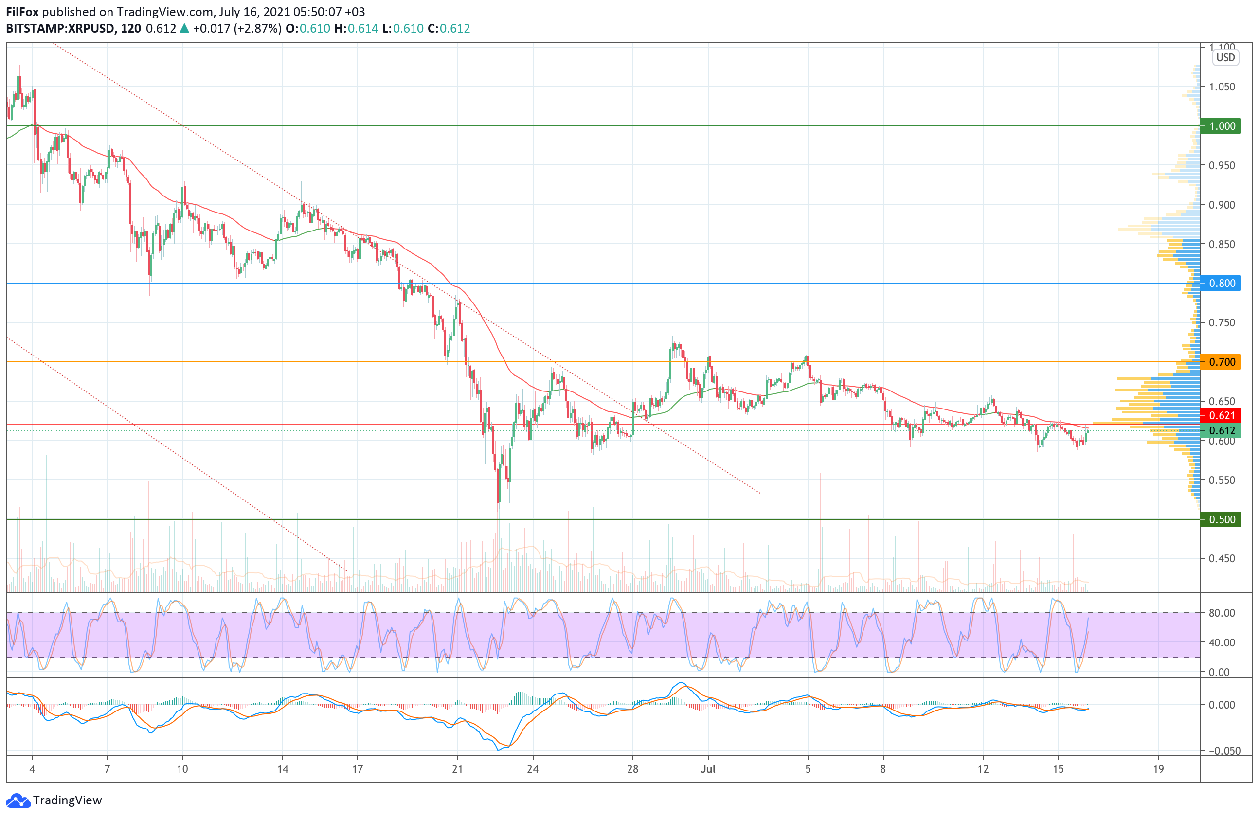 Из-за мелких объёмов дальнейший рост пока затруднён, но если покупатели смогут сформировать бычий импульс, то цена сможет закрепиться выше линии Point Of Control (0.621 USD).