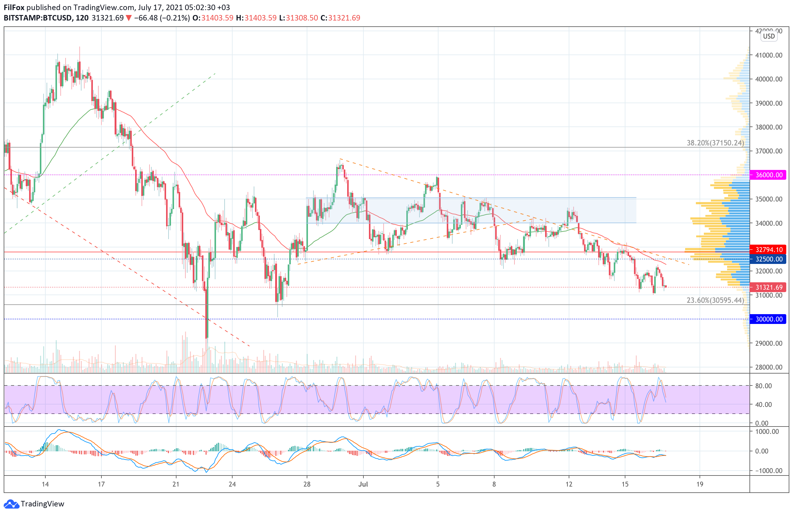 Вчера цена биткоина обозначила новый июльский минимум в районе отметки 31000.00 USD. Во второй половине дня торги немного оживились, и покупатели попытались восстановить пару в область средних цен, но до конца дня так и не смогли протестировать двухчасовую EMA55.