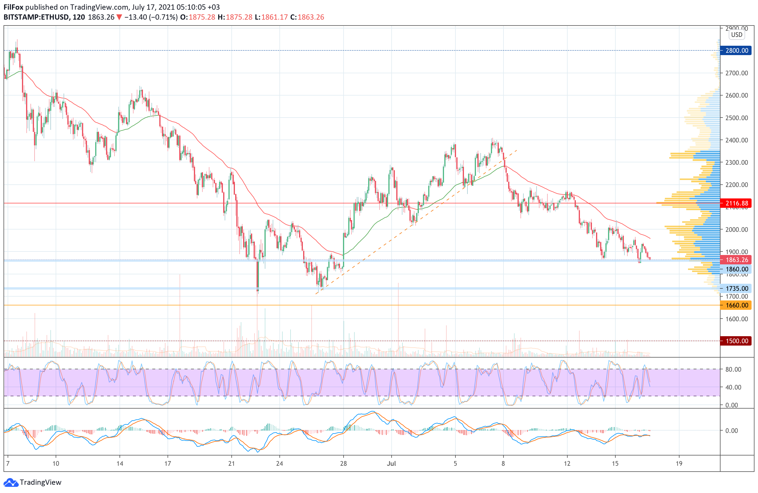 Вчера днём верхняя граница голубого коридора (1860.00 USD) удержала цену Ethereum от дальнейшего снижения. Покупатели попытались восстановить пару к психологической отметке 2000.00 USD, однако восстановление не было поддержано крупными объёмами и цена даже не смогла протестировать двухчасовую EMA55.