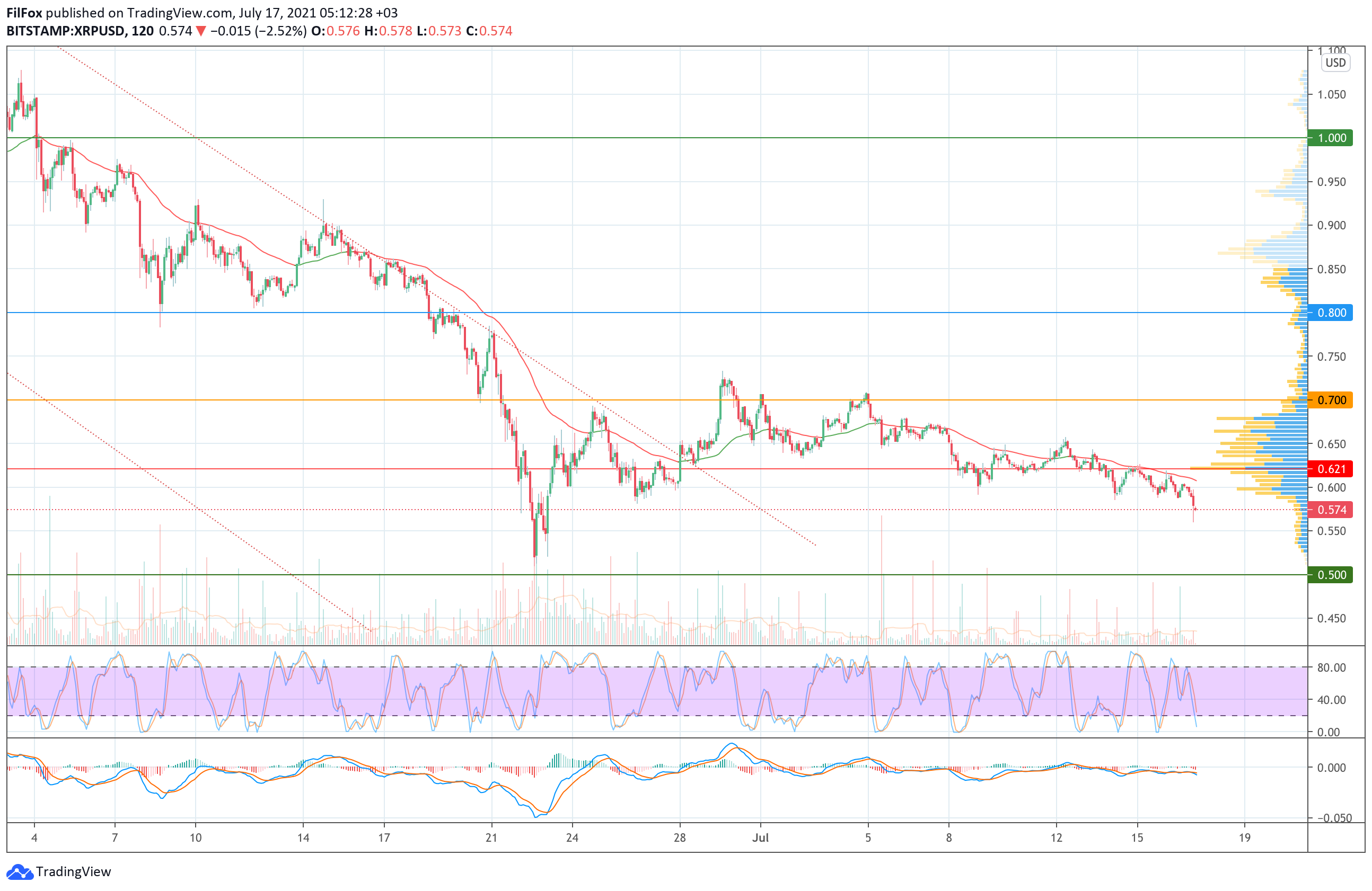 Вчера объёмы покупок Ripple существенно превысили средний уровень торгов, но этот всплеск не позволил покупателям прорвать двухчасовую EMA55.