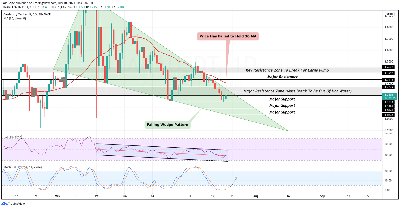 За последние пару недель цена ADA упала на 25% к сильному уровню поддержки. Такое ценовое движение не является неожиданностью - в это же время BTC несколько раз тестировал поддержку $31,000.