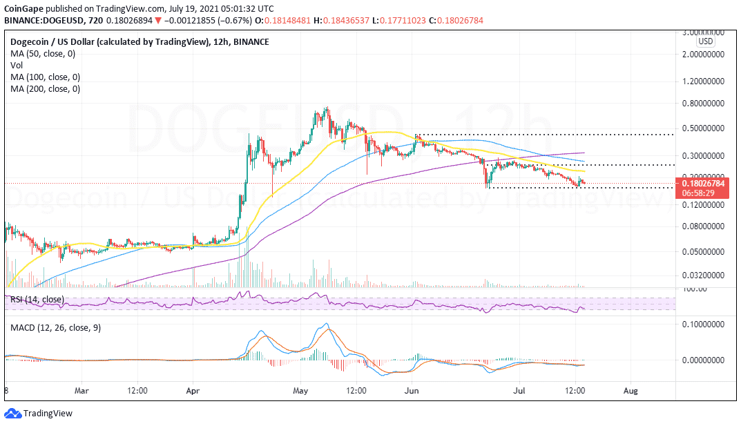 На данный момент DOGE торгуется около $0,18. Ближайший уровень поддержки все еще находится на $0.16. Чем дольше DOGE остается ниже $0.2, тем сильнее становятся медведи. Закрытие дневной свечи ниже $0.16 может продлить бычий забег до $0.1.
