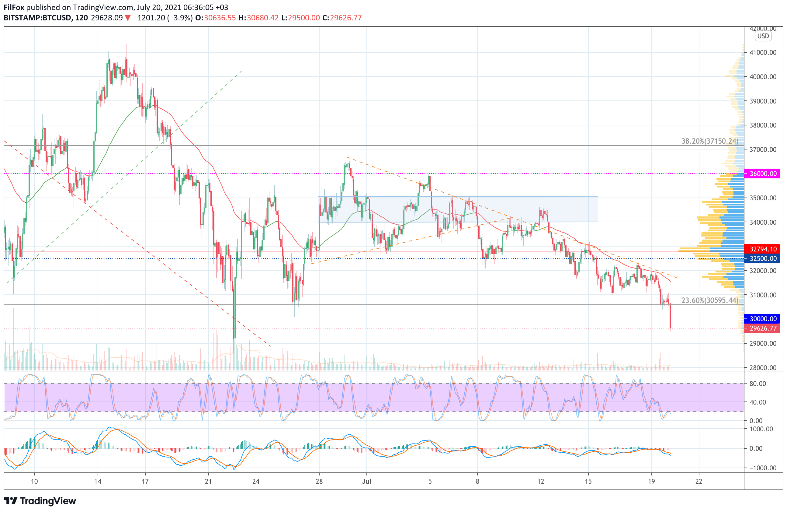 Вчера медведи усилили давление и протестировали уровень 23.6% фибо (30595.44 USD), к которому около месяца им не удавалось приблизится. Сегодня ночью цена прорвала эту поддержку и упала ниже психологической отметки 30000.00 USD.