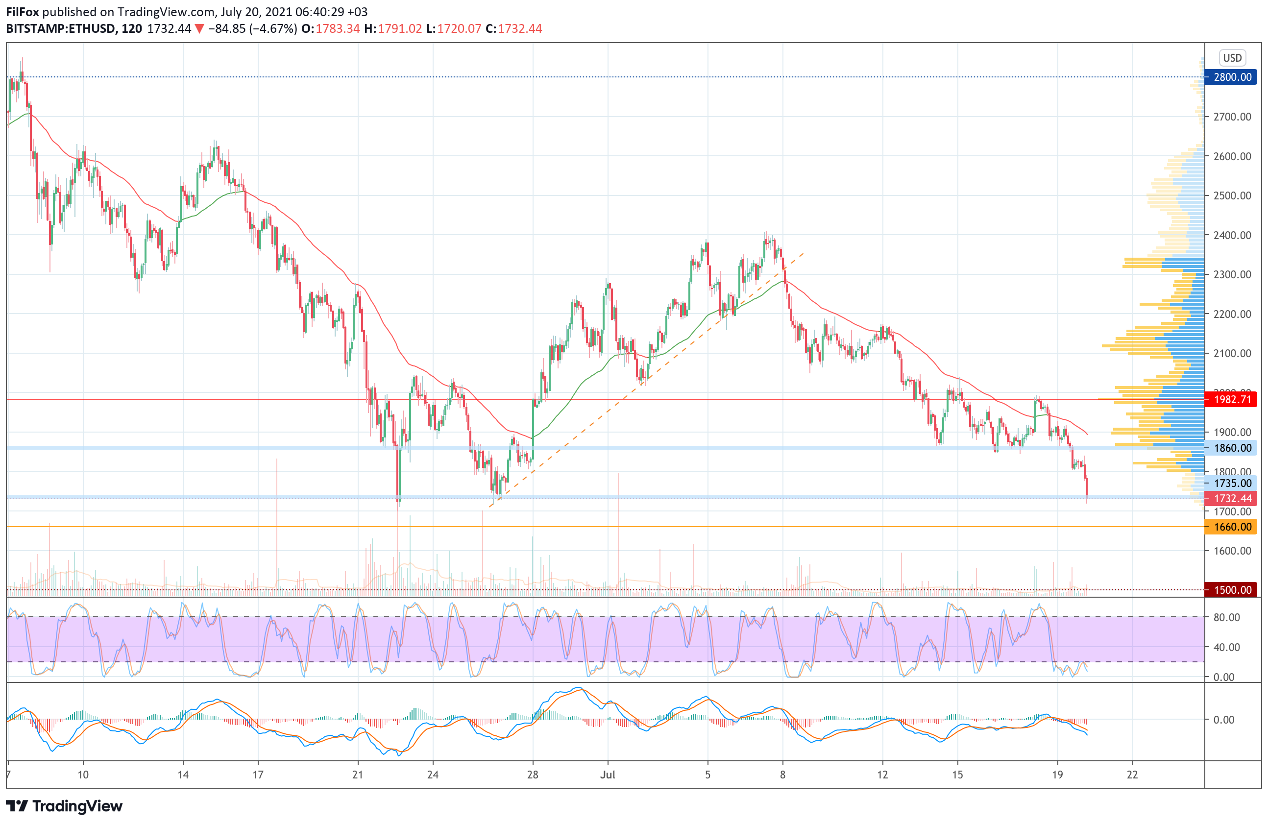 Вчера цена Ethereum пробила поддержку 1860.00 USD и опустилась в голубой боковой коридор. Сегодня ночью снижение пары продолжилось и продавцы прокололи нижнюю границу диапазона 1735.00 USD, установив месячный минимум в районе отметки 1720.00 USD.