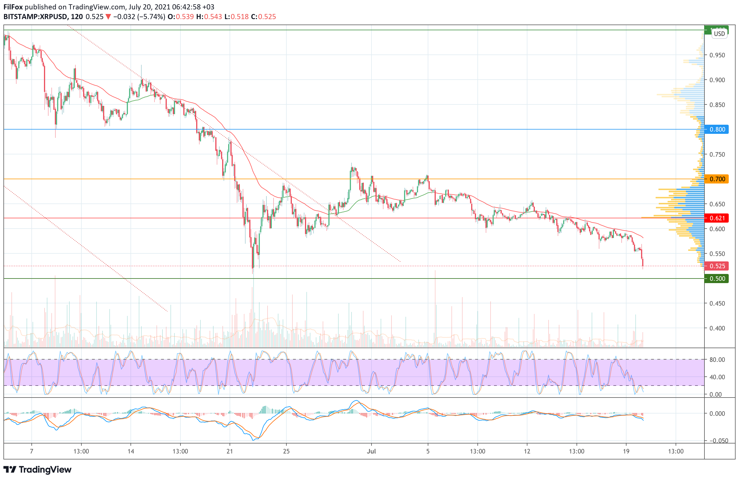 Вчера, когда снижение цены XRP достигло отметки 0.555 USD покупатели попытались перехватить инициативу и сформировали достаточно мощный бычий импульс, но крупные объёмы продаж поглотили его, и пара продолжила снижение к новому июльскому минимуму в точке 0.518 USD.