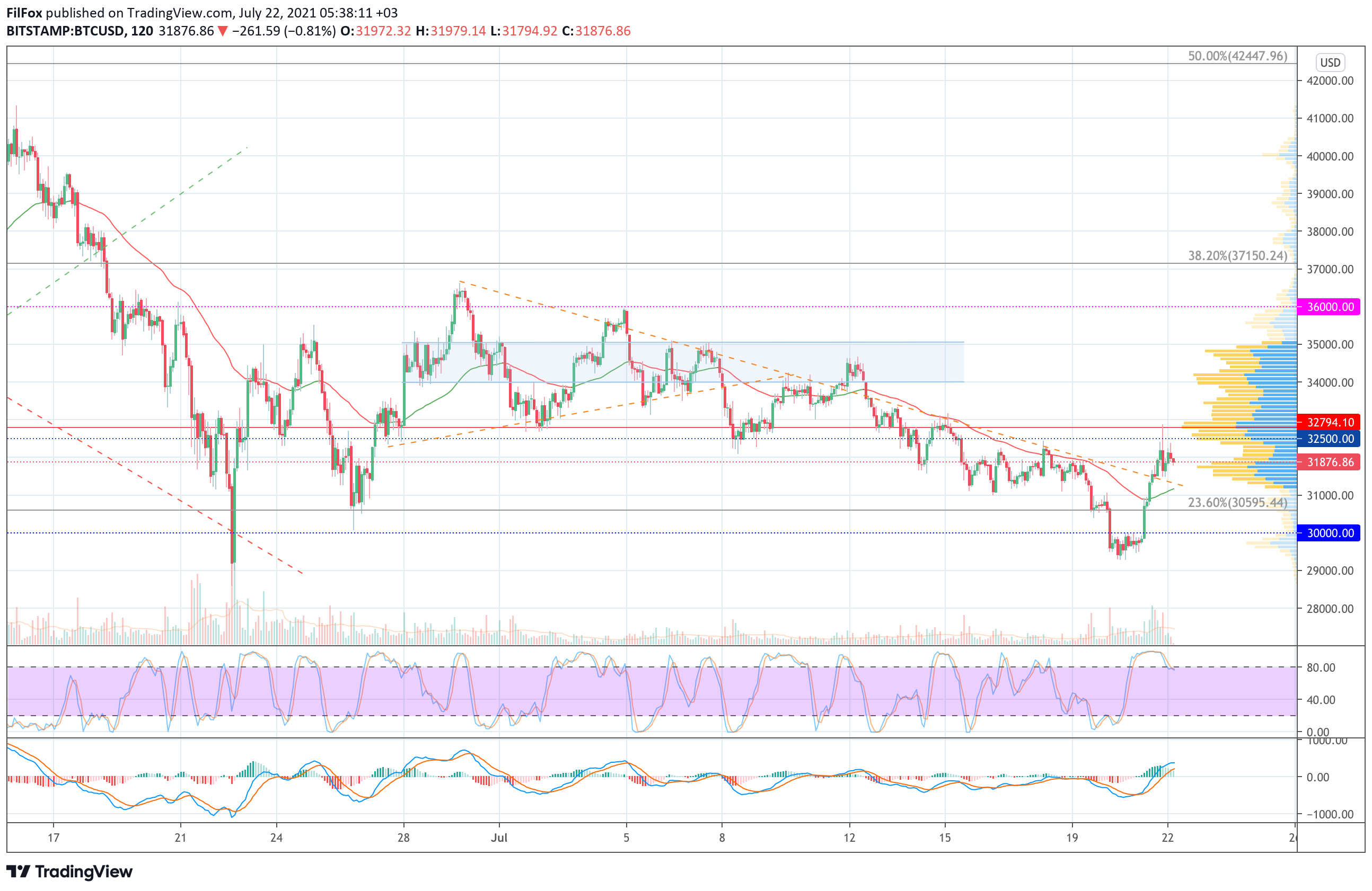 Возможно, в ближайшее время цена откатится в область двухчасовой EMA55. Если эта скользящая средняя удержит пару от глубокого отката, то быки попытаются закрепиться выше линии POC (32794.10 USD).