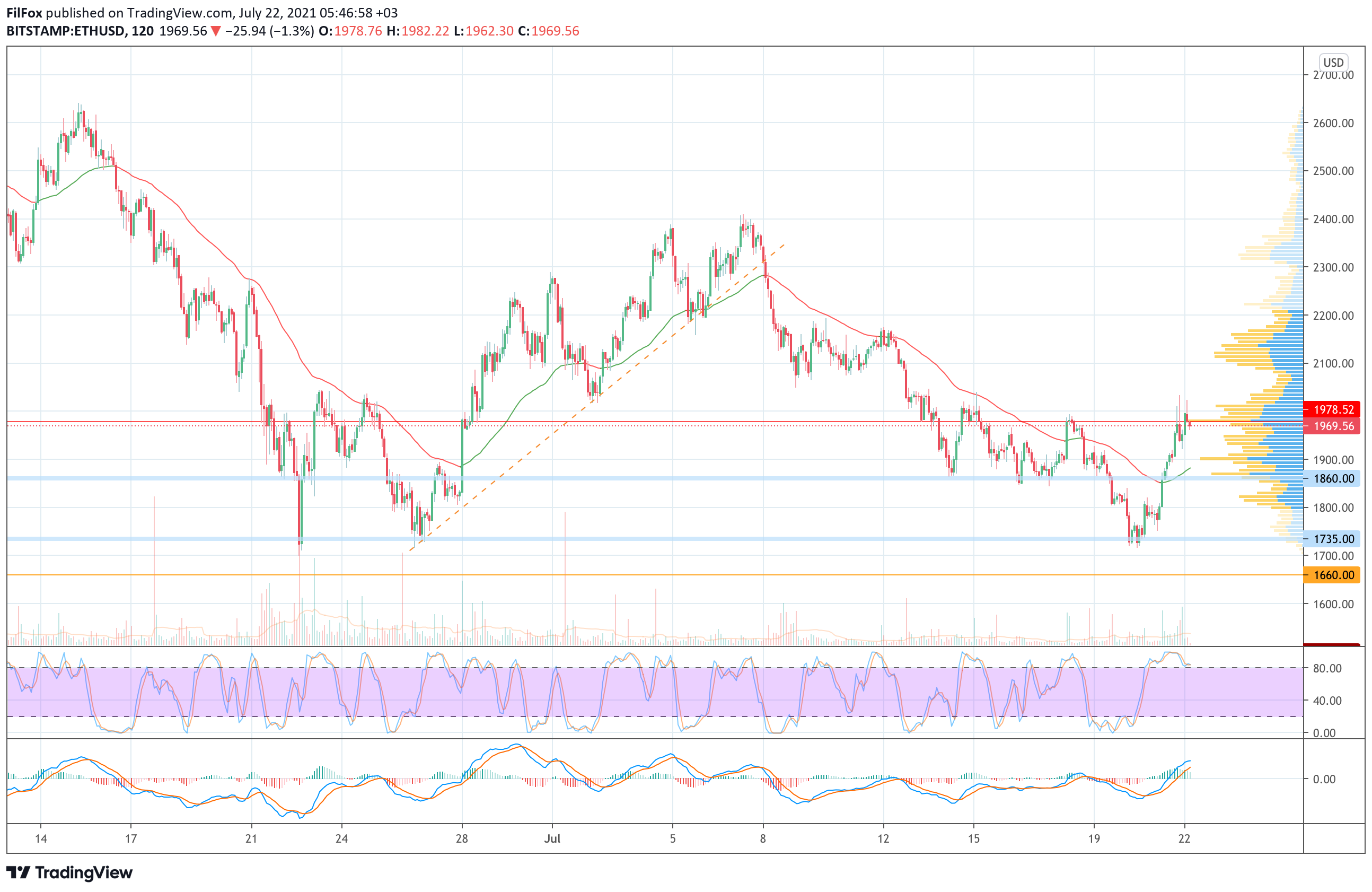 Вчера цена Ethereum последовала за криптовалютным флагманом и пробила верхнюю границу голубого коридора 1860.00 USD. Дальнейший рост проходил на средних объёмах, и ближе к концу дня пара протестировала психологический уровень 2000.00 USD.