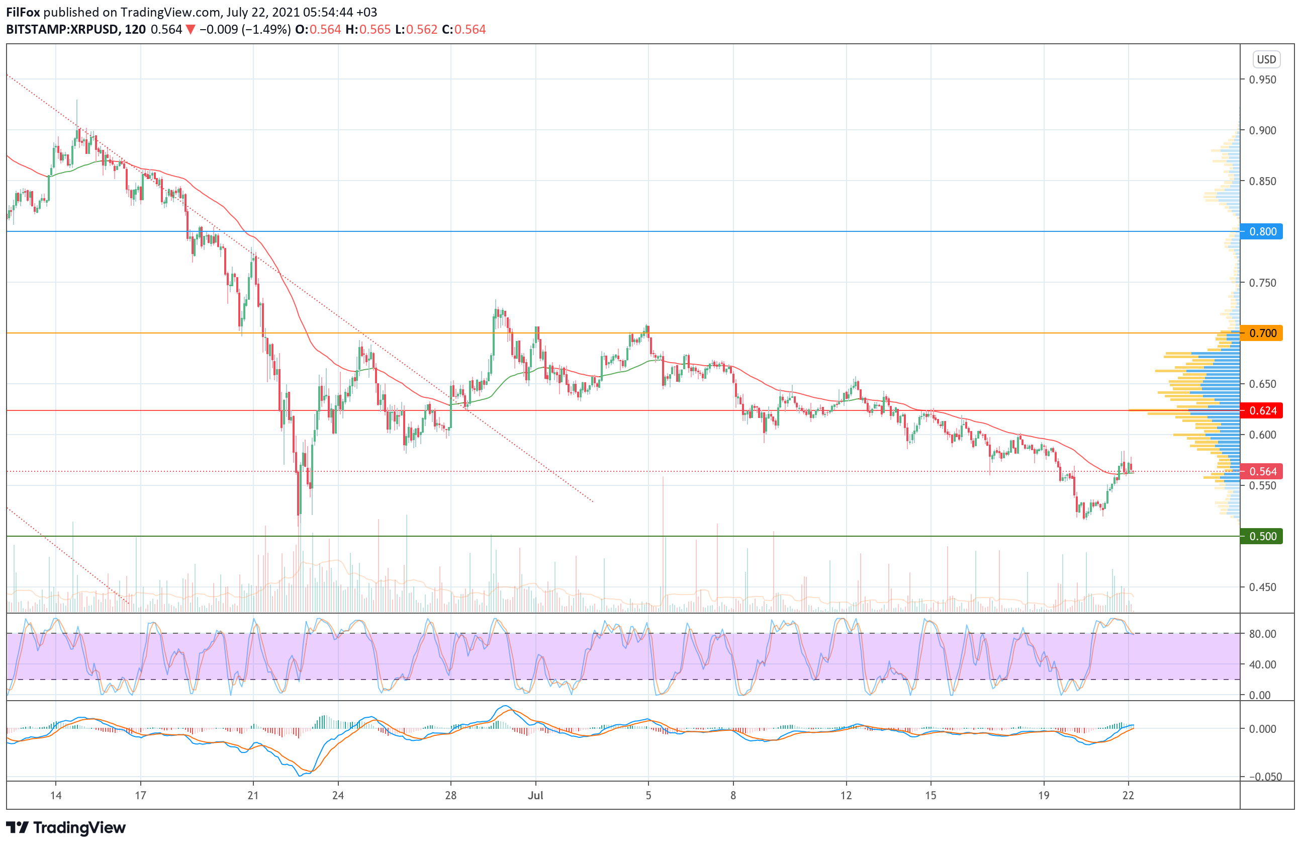 Если продавцы оттеснят цену ниже уровня двухчасовой EMA55, то цена Ripple вернётся в зону июльского минимума.
