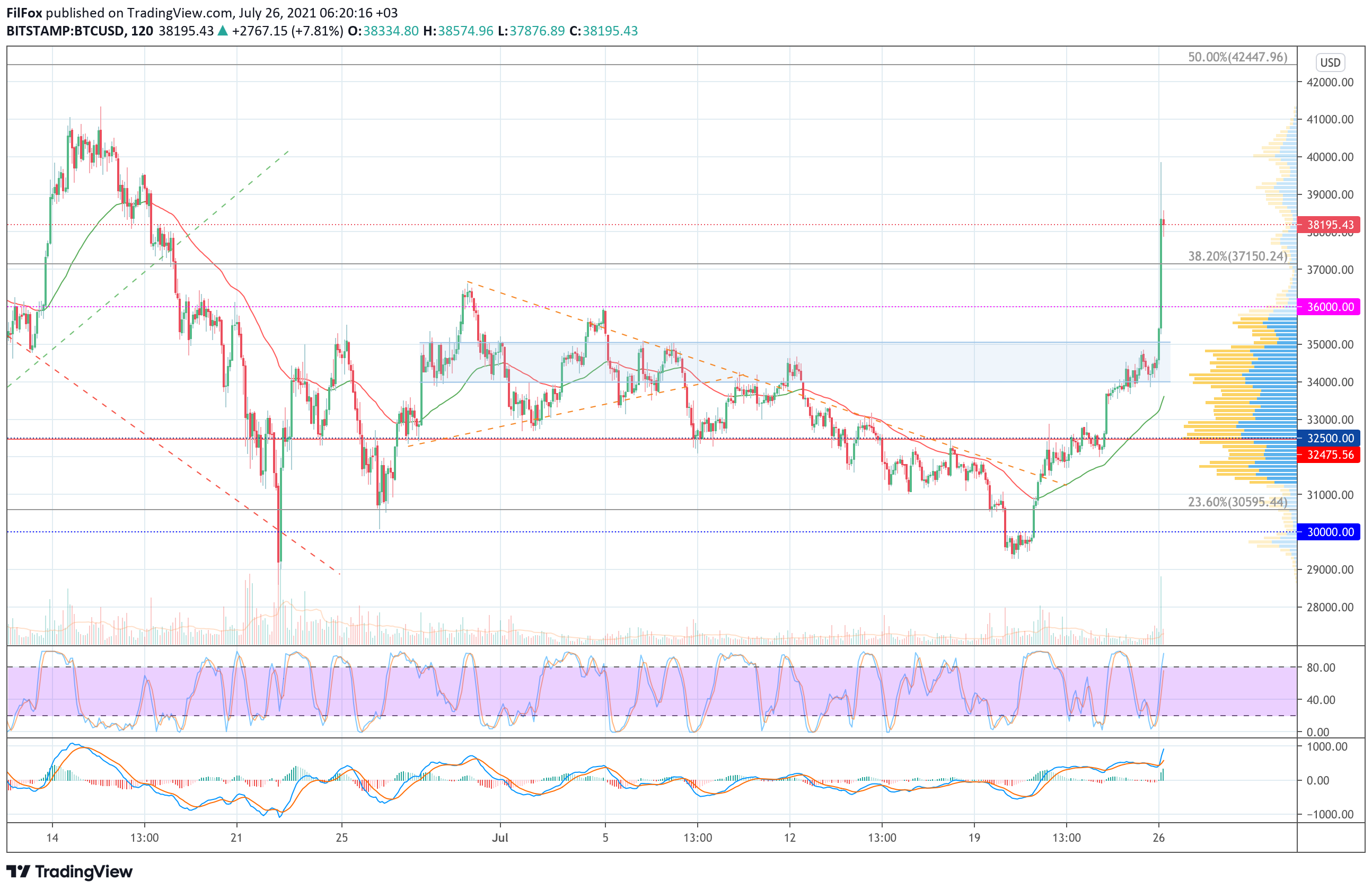Если же продавцы продавят поддержку 38000.00 USD, то цена откатится к уровню 38.2% фибо (37150.24 USD).