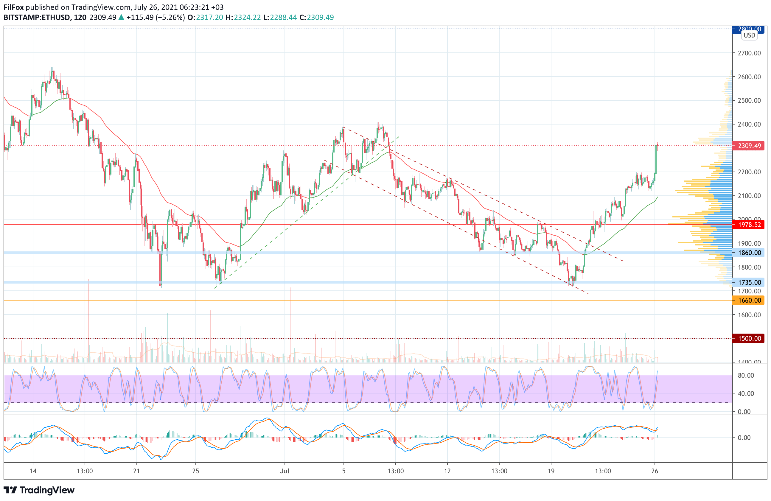 Утром цена немного откатилась, но в районе 2300.00 USD ощущается слабая поддержка, которая приостановила снижение пары. Если она удержит цену от падения, то покупатели могут обновить июльский максимум, который был установлен 07.07.2021 в районе отметки 2410.00 USD. В противном случае - пара вернётся к уровню 2200.00 USD.