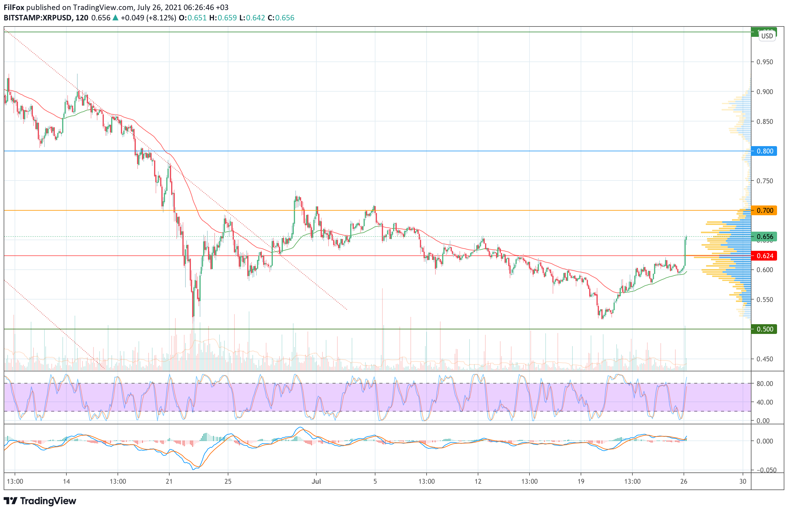 Если быки продолжат рост цены XRP, то пара может обновить июльский максимум выше оранжевого уровня 0.700 USD, а после - следует ожидать откат в область средних цен.