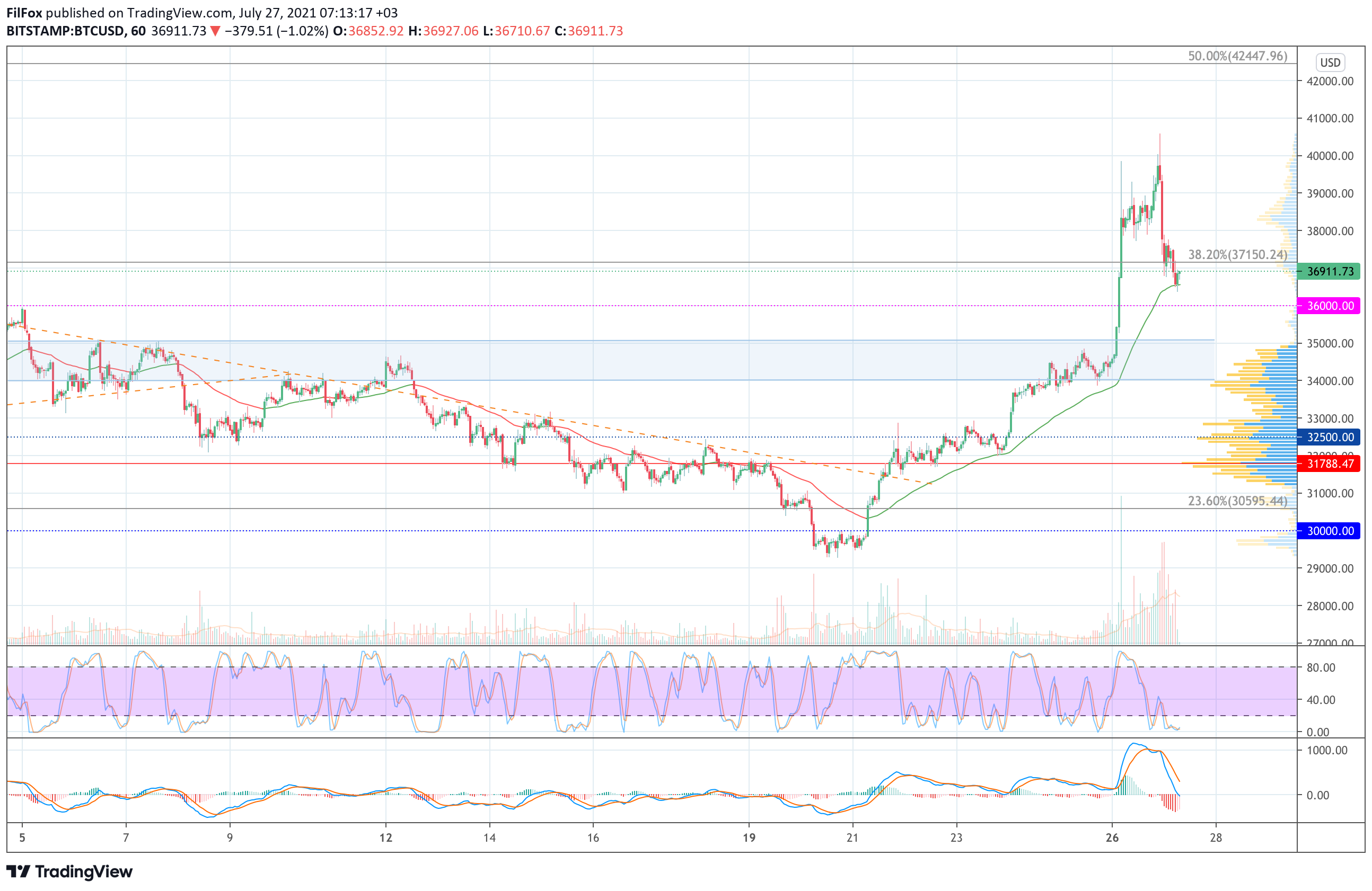 Медведи ответили жестким прессингом и ночью вернули цену BTC к уровню 38.2% фибо (37150.24 USD). На утро медвежье давление ослабло, но цена продолжила снижение к часовой скользящей средней EMA55. Уровень средних цен приостановил снижение, и возможно, покупатели попробуют вернуть пару к июльскому максимуму.