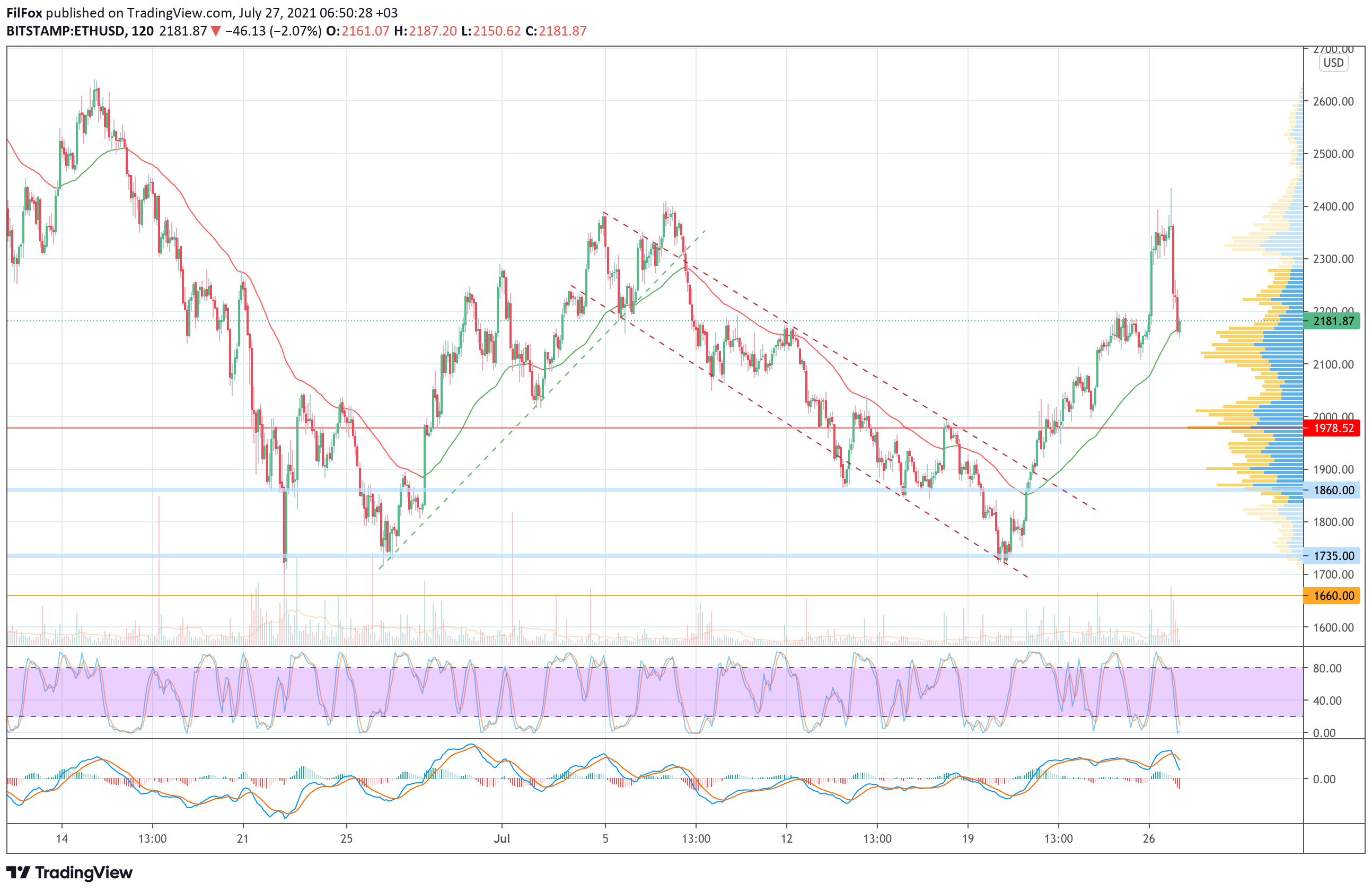 До завершения дня цена эфира не смогла удержаться в зоне максимума и откатилась к поддержке 2200.00 USD. На утро объёмы продаж сократились, но цена ETH продолжила снижение к двухчасовой EMA55. Скользящая средняя замедлила снижение и удерживает пару в краткосрочной консолидации.