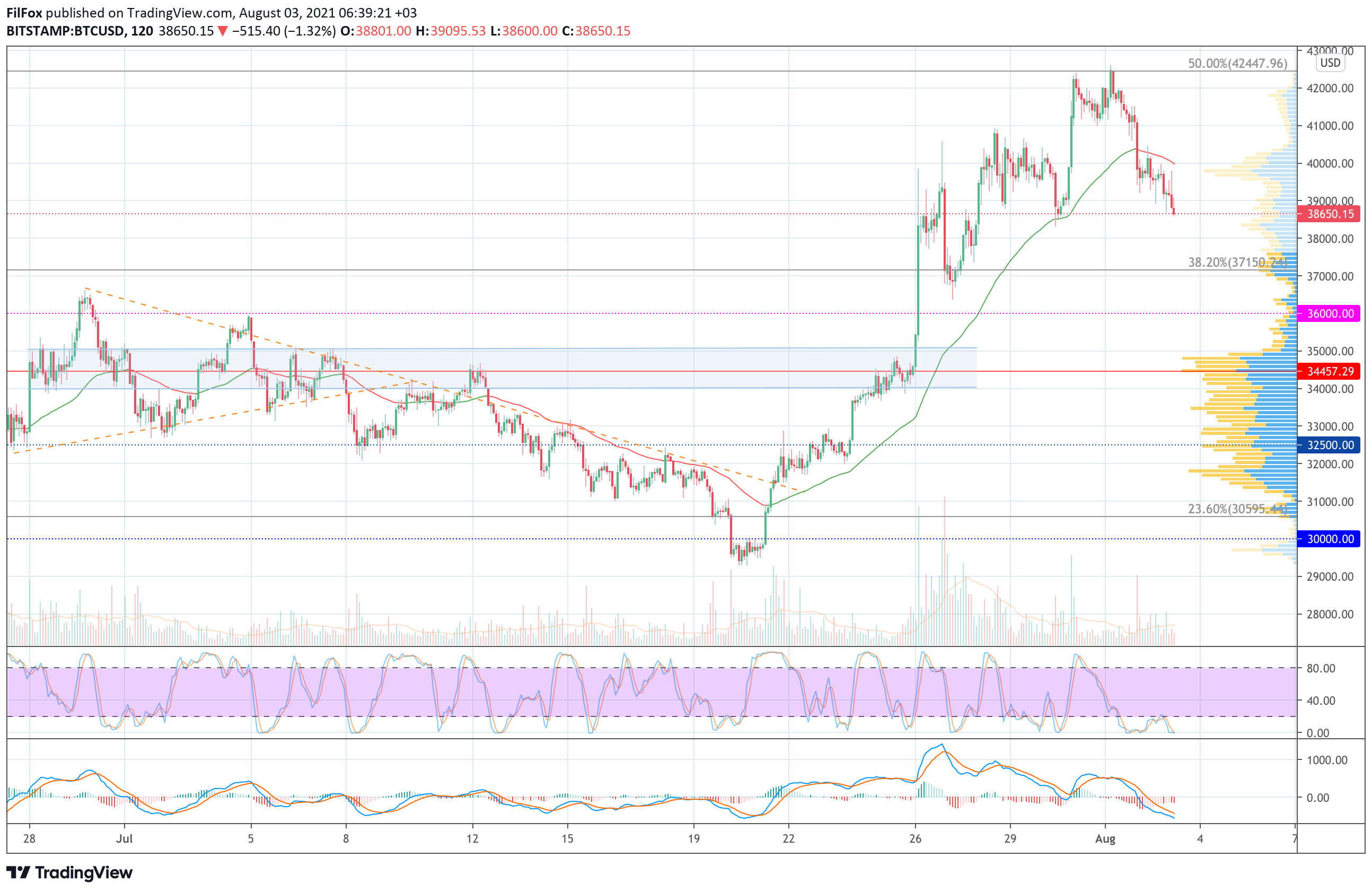 Вечером медведи усилили натиск и продолжили снижение цены Bitcoin. На сегодняшнее утро продавцы протестировали уровень 38500.00 USD, а в течение дня пара может достигнуть ближайшей поддержки на уровне 38.2% фибо (37150.24 USD).