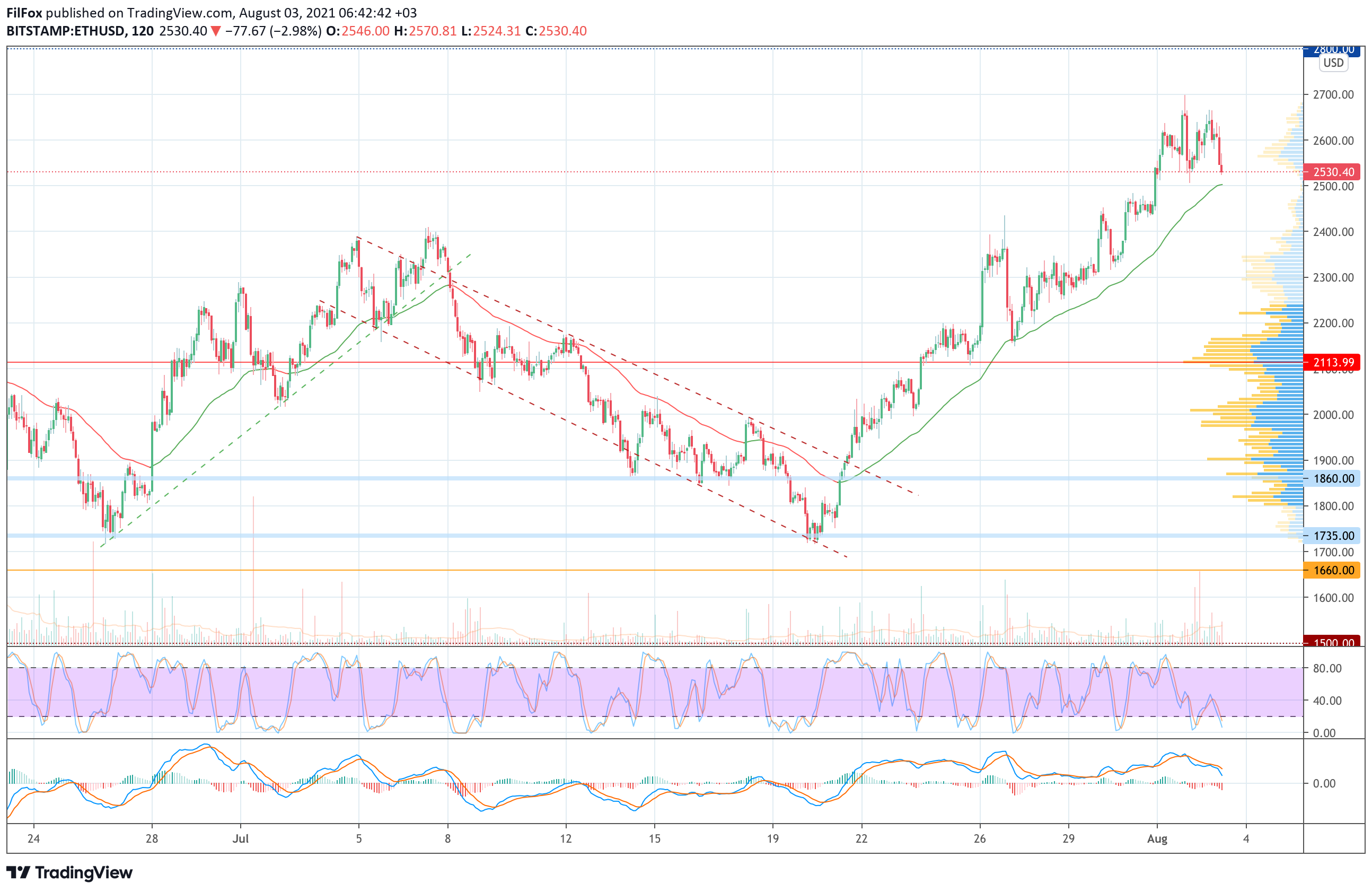 Вчера в течение дня быки пытались вернуть цену Ethereum в зону максимума. Вечером, после ре-теста уровня 2666.00 USD, силы быков иссякли и пара откатилась в область средних цен.