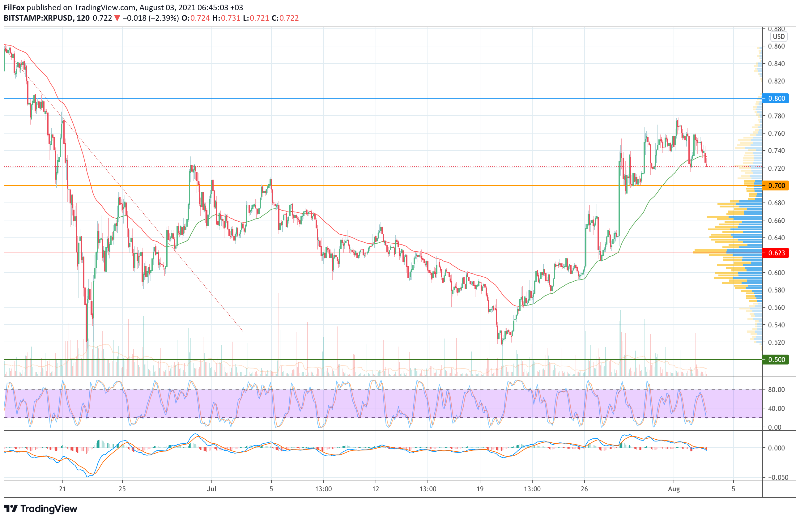 Вчера пара XRP/USD пыталась закрепиться выше двухчасовой EMA55, но в конце дня медведи оттеснили цену ниже скользящей средней.