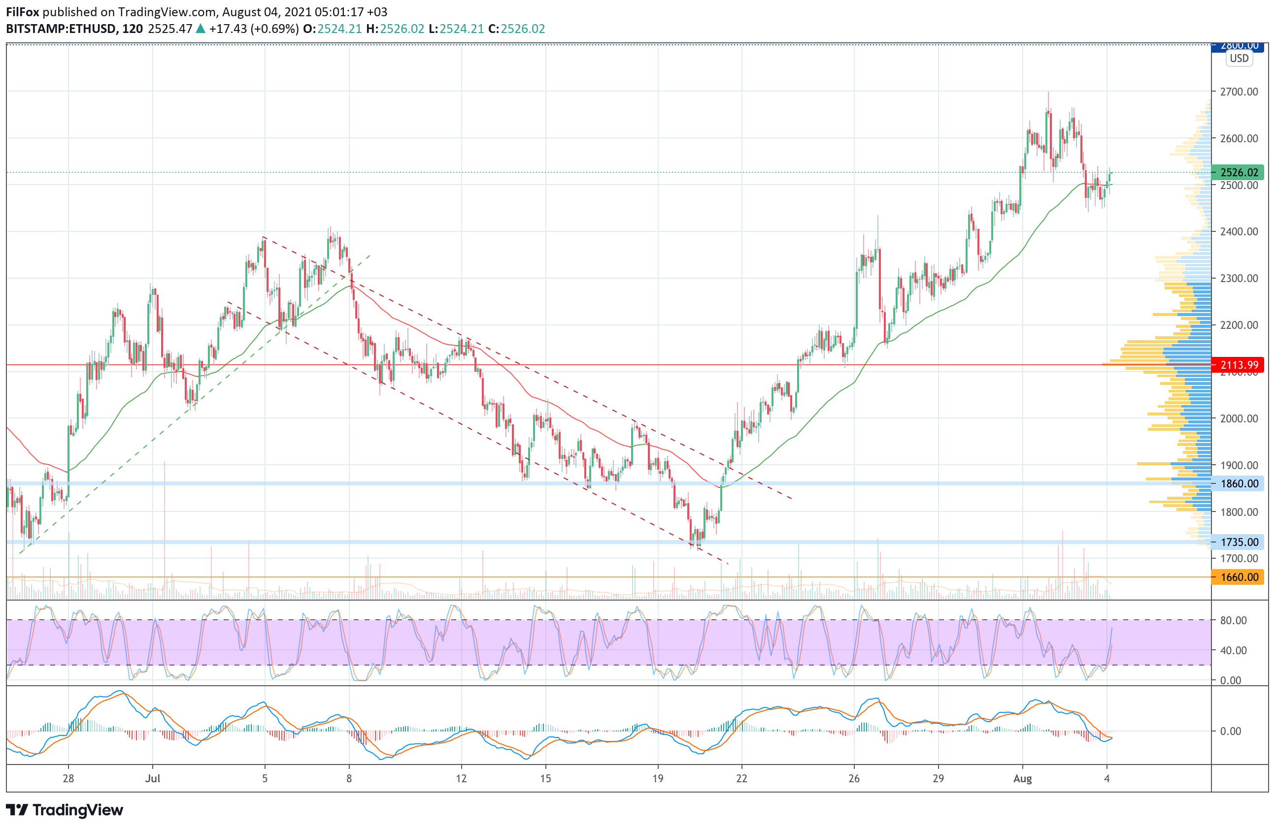 Вчера в первой половине дня медведи оттеснили цену Ethereum ниже двухчасовой EMA55. После ре-теста поддержки 2440.00 USD снижение приостановилось и цена эфира закрепилась в боковой консолидации.