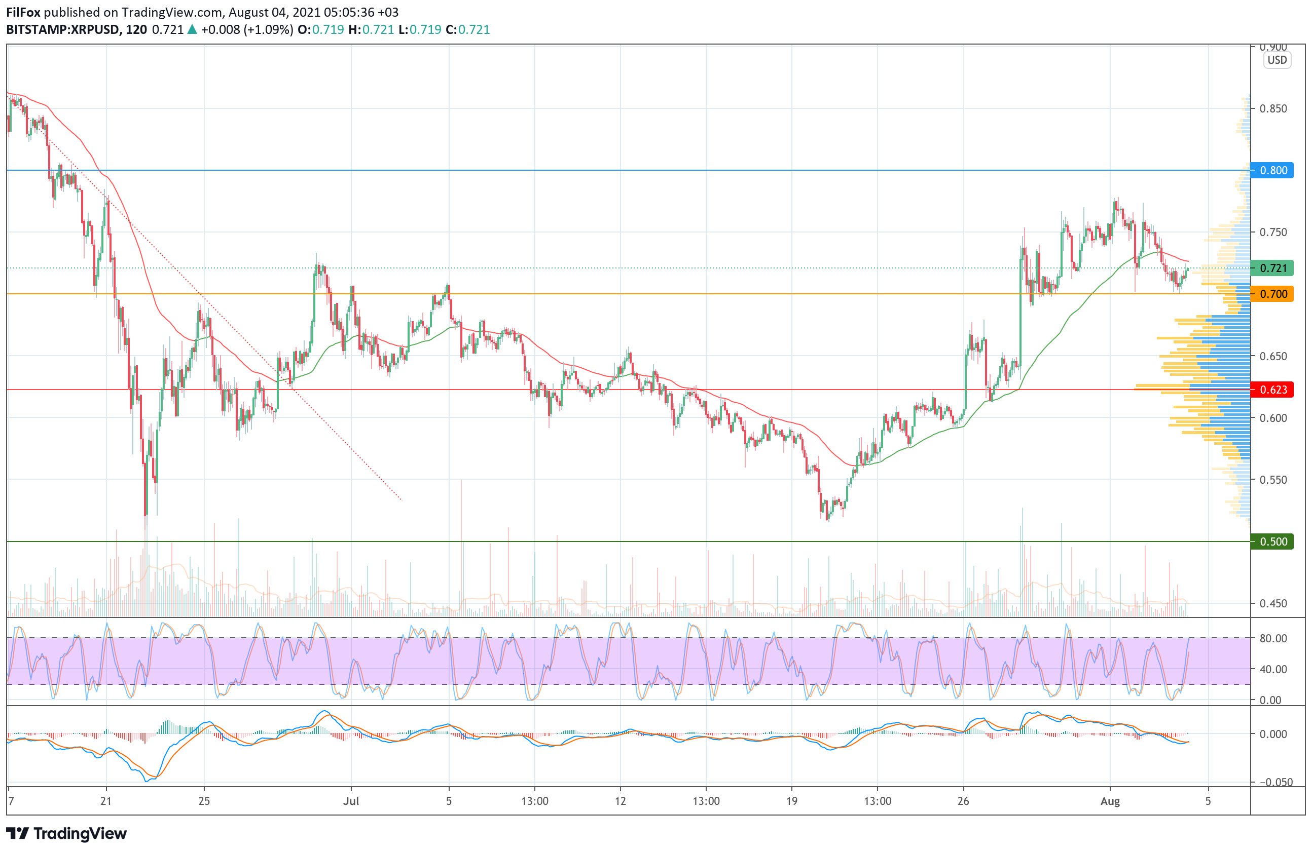 Снижение цены XRP приостановилось в районе оранжевой поддержки 0.700 USD. Пара установила августовский минимум в точке 0.701 USD и на сегодняшнее утро восстановилась к двухчасовой EMA55.