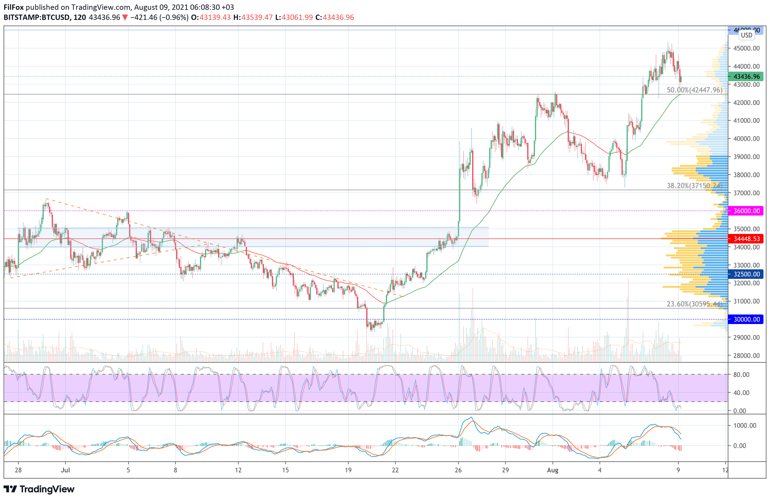 Откат получился достаточно глубокий и приостановился в области пятидесятипроцентного уровня фибоначчи, в районе отметки 42800.00 USD. Если сегодня покупатели смогут сформировать бычий импульс, то пара протестирует сопротивление 46000.00 USD.