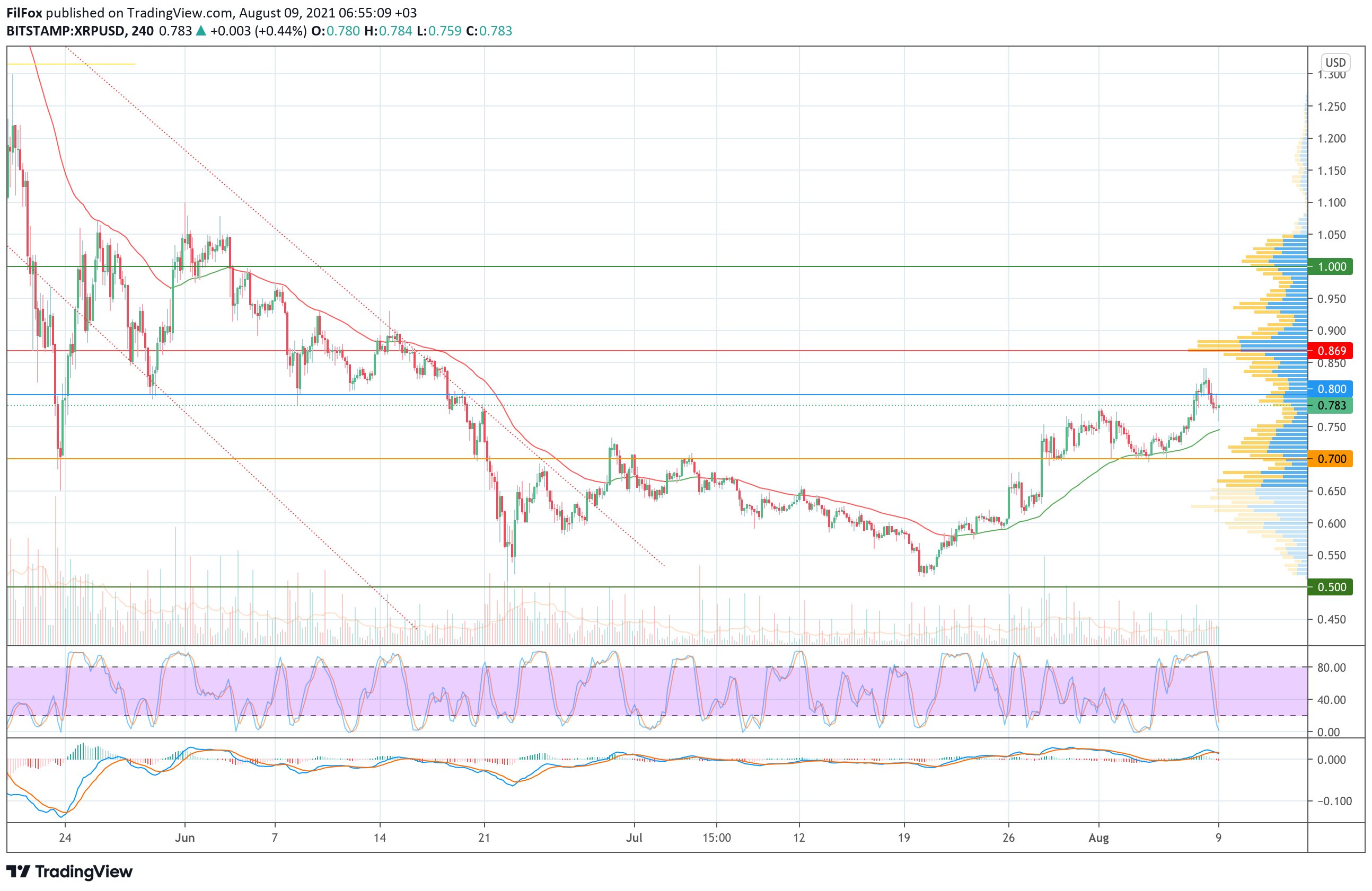 На выходных цена XRP смогла продемонстрировать рост и пробила сопротивление 0.800 USD. Целевой отметкой быков служила индикаторная линия POC (0.869 USD), но до конца недели цена так и не смогла протестировать этот уровень.
