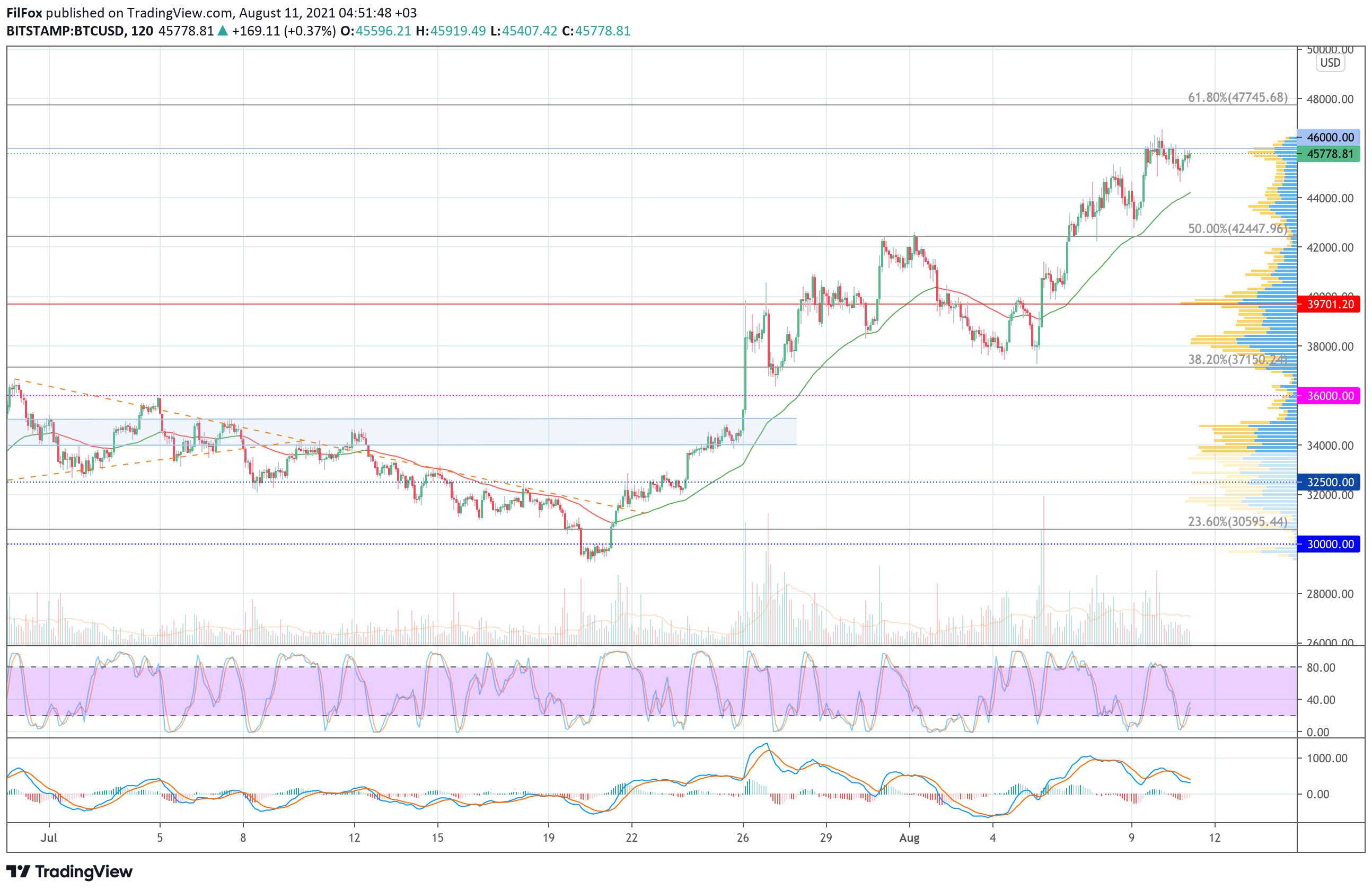 Сопротивление на уровне 46000.00 USD пока сдерживает натиск быков, но в ближайшее время возможно обновление месячного максимума цены BTC в районе 48000.00 USD.