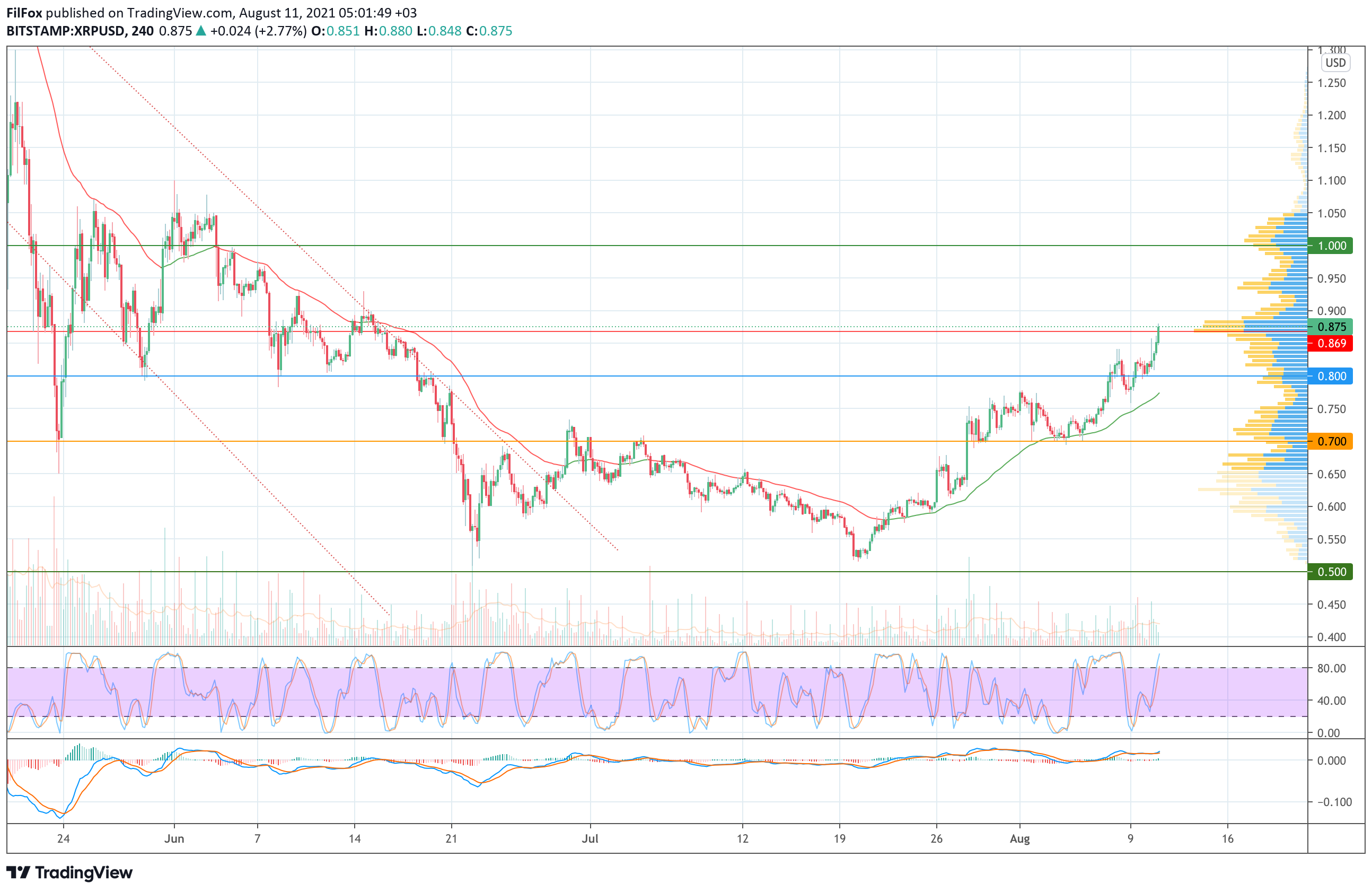 Вчера утром цена XRP удержалась выше ключевого уровня 0.800 USD, а в течение дня покупателям удалось продолжить рост. Сегодня ночью быки пробили целевую отметку в виде линии POC (0.869 USD), установив августовский максимум в точке 0.883 USD.