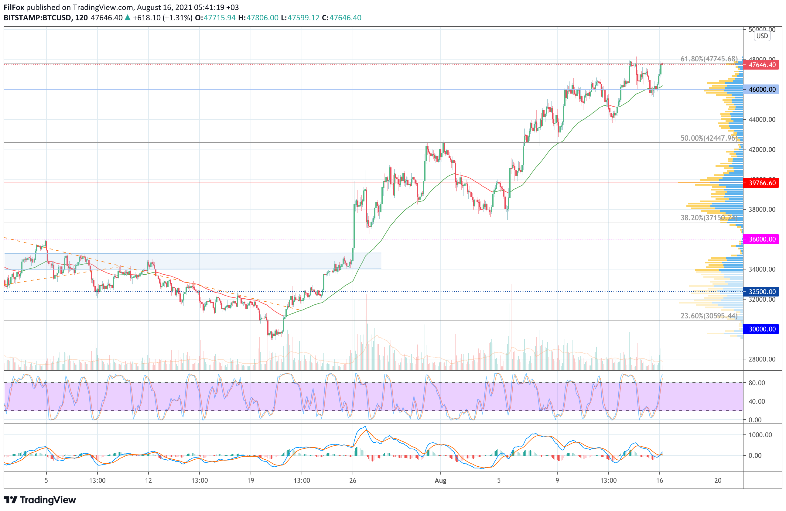 В минувшую субботу цена биткоина консолидировалась в узком диапазоне на уровне 61.8% фибо (47745.68 USD). В какой-то момент пара проколола сопротивление 48000.00 USD, обновив месячный максимум в точке 48190.00 USD, но продавцы сразу же сбили цену к поддержке 46000.00 USD.
